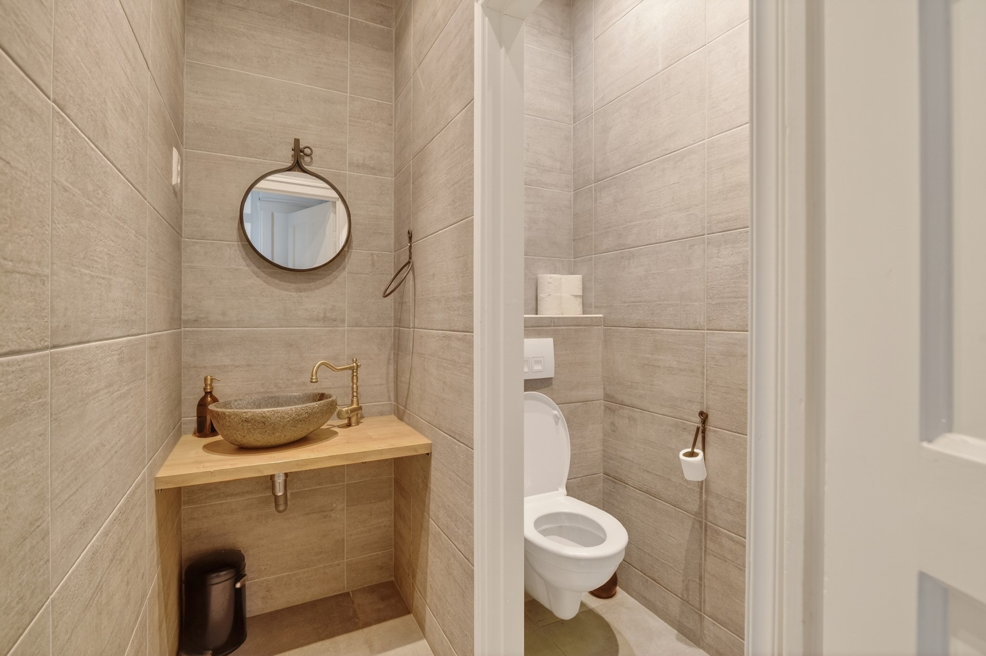 Middels de eigen entree aan de straatzijde betreedt u de entreeruimte, momenteel voorzien van een bar. De begane grond bestaat uit meerdere separate (werk)kamers, welke flexibel in te delen zijn naar wens. Centraal bevindt zich een nette toiletruimte met wastafelmeubel.