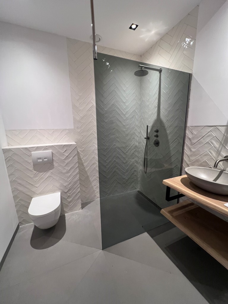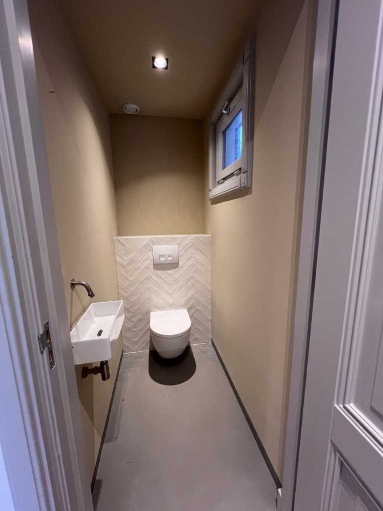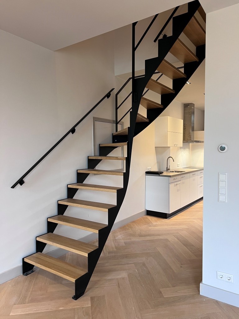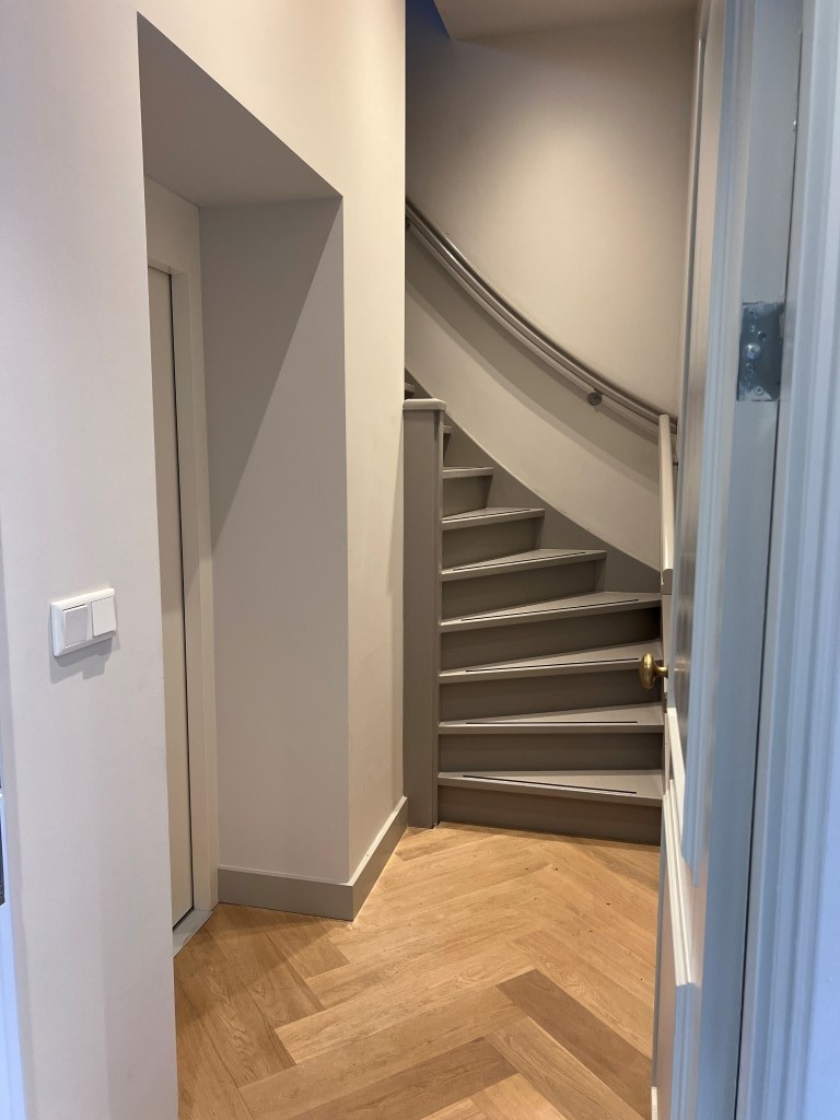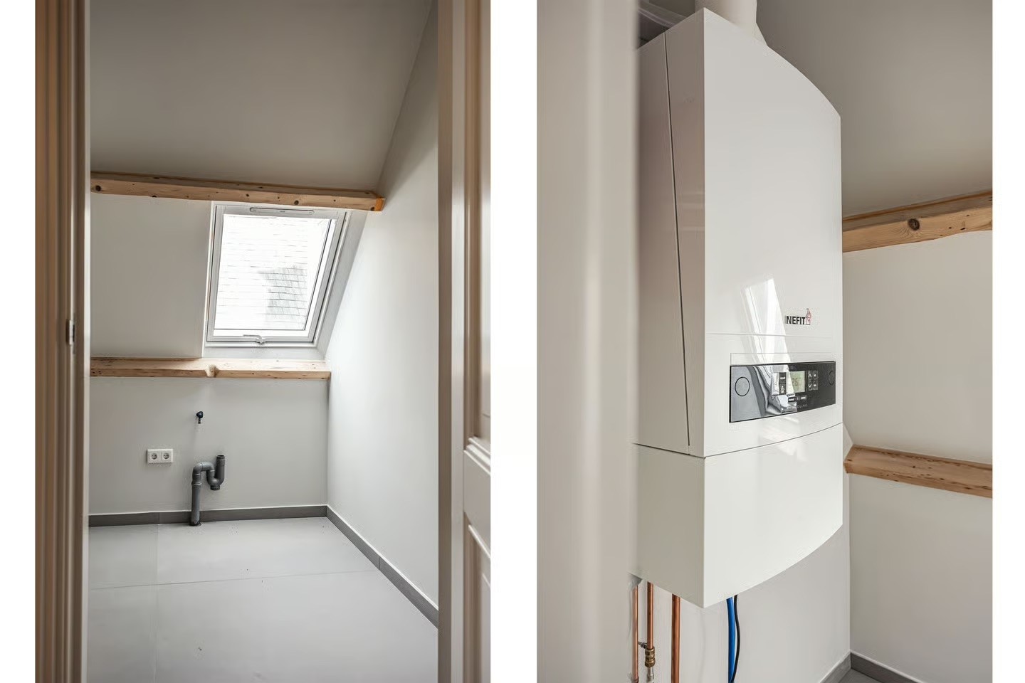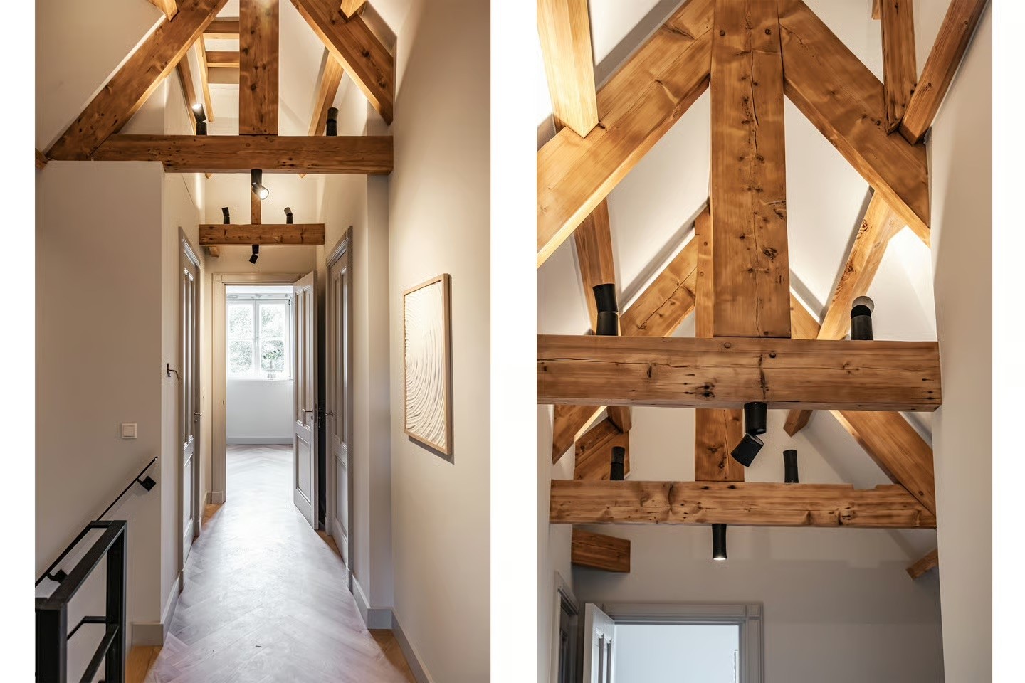 A modern staircase leads to the second floor with spacious landing where the beam structure is showing. Here you will find a very spacious main bedroom with a luxurious en-suite bathroom featuring a bathtub, double washbasin, toilet, and walk-in shower. The original wooden beams add warmth and character, while the high ceilings and oak herringbone floors with underfloor heating create a refined atmosphere.