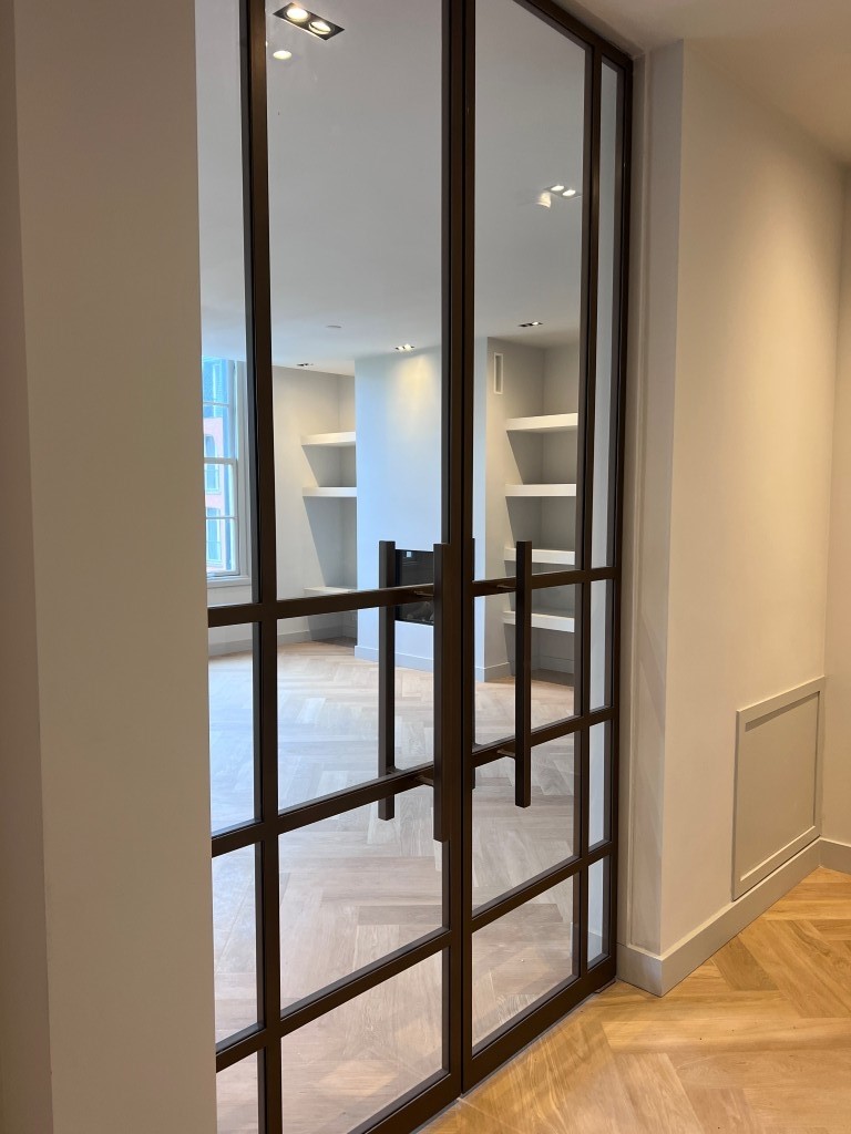 Spacious hallway with a generous guest toilet. Elegant steel pivot doors open into the impressive living room with large windows offering an unobstructed view of the park and historic pond. The living area features a beautiful custom-built wall unit with an integrated gas fireplace. The fully equipped kitchen is located at the back close to a cozy dining area providing access to a classic balcony through French doors overlooking the entrance and the woodland opposite.