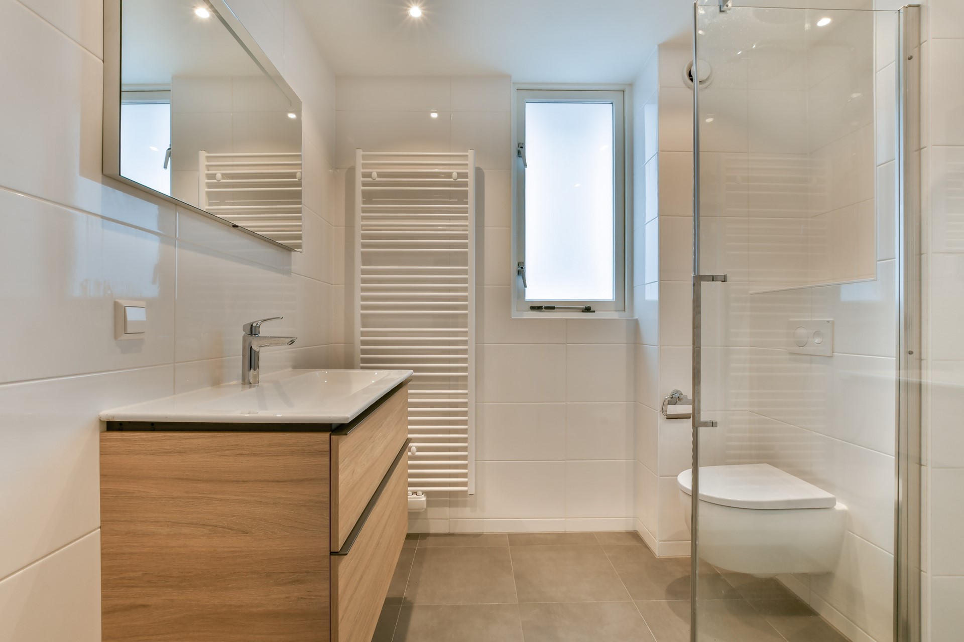 On the first floor, there are three bedrooms, all accessible via the landing. The rooms vary in size and are suitable as a master bedroom, children’s rooms, or a home office. The landing also gives access to the bathroom, which is tiled and features a walk-in shower with a glass partition, a vanity with sink, a floating toilet, and a designer radiator.