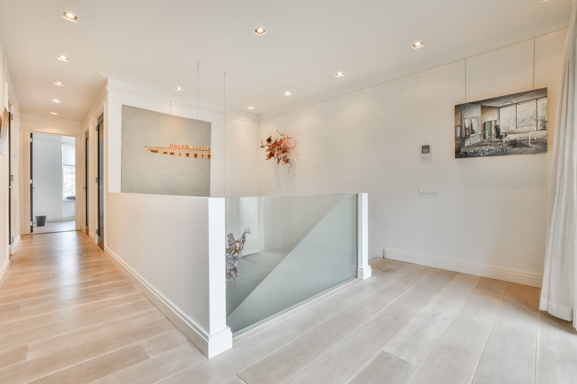 The stairs lead to the first floor with three spacious bedrooms and two bathrooms. One bathroom has a bathtub, double sink and shower. The second bathroom has a shower and sink. On this floor, there is a second toilet. At the back, there is a balcony.