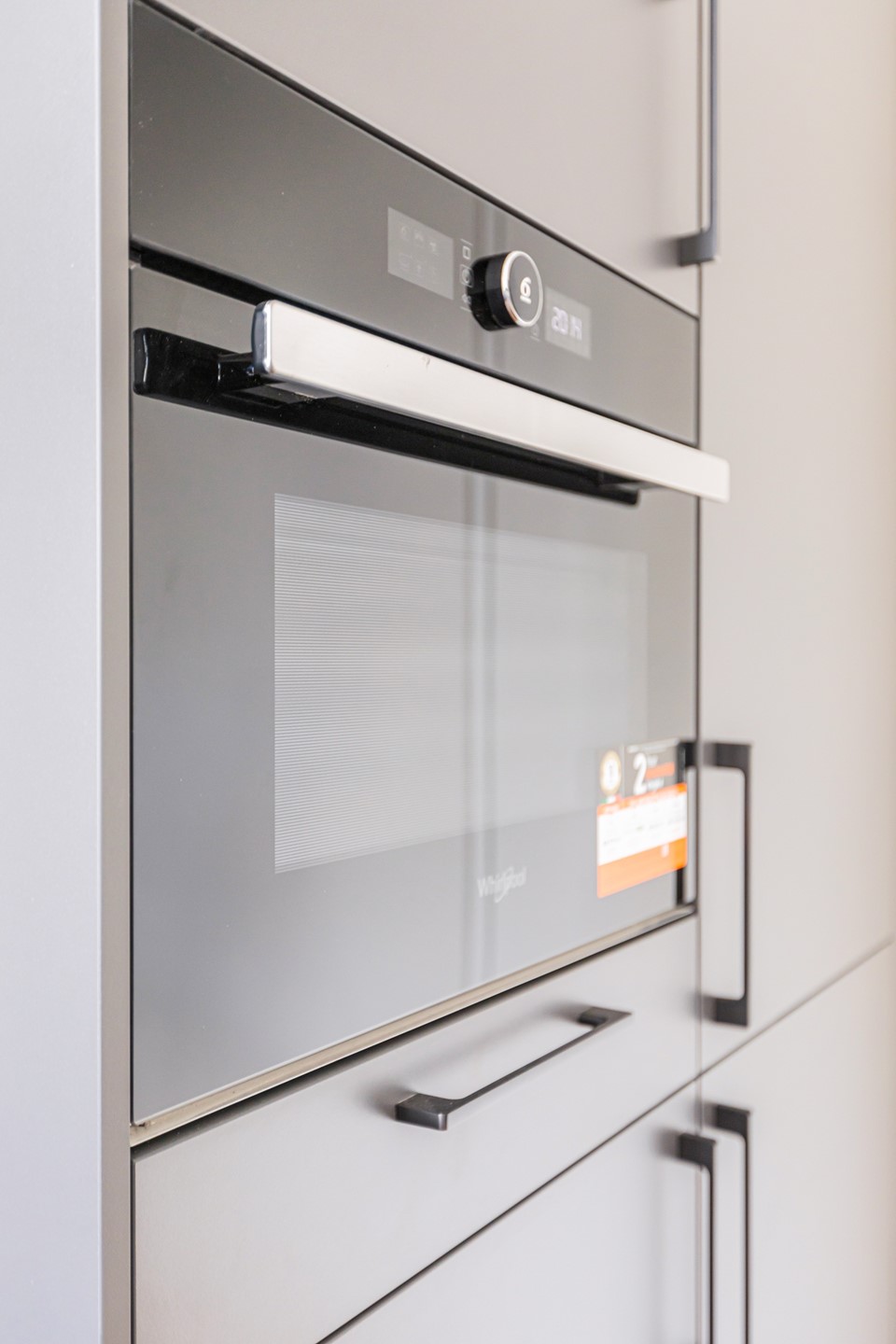 Upon entering, you step into a spacious hallway with access to a separate guest toilet and a practical storage room equipped with a washing machine connection. The hallway leads into a bright and open-plan kitchen and living area, featuring a modern kitchen with high-end built-in appliances, including: