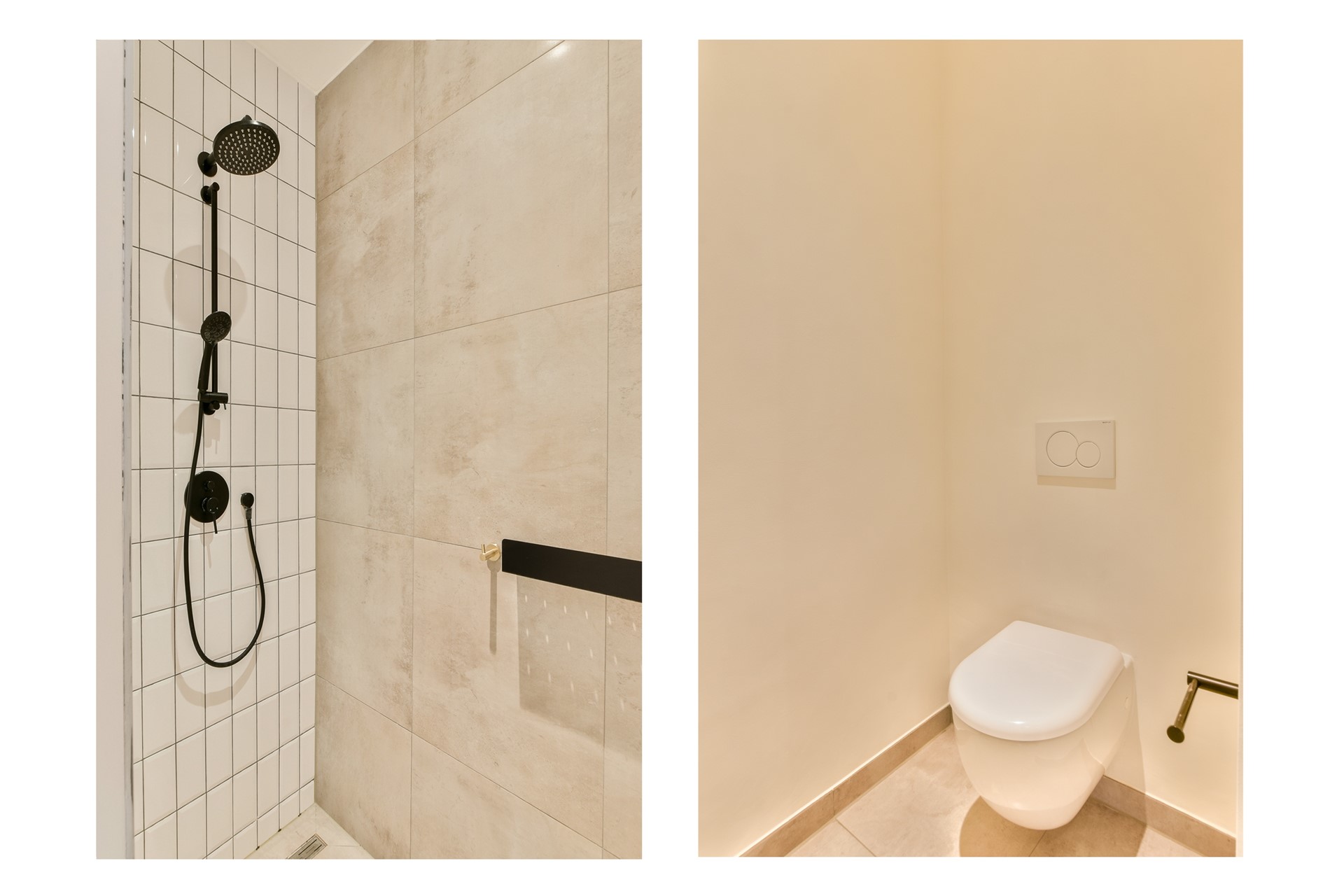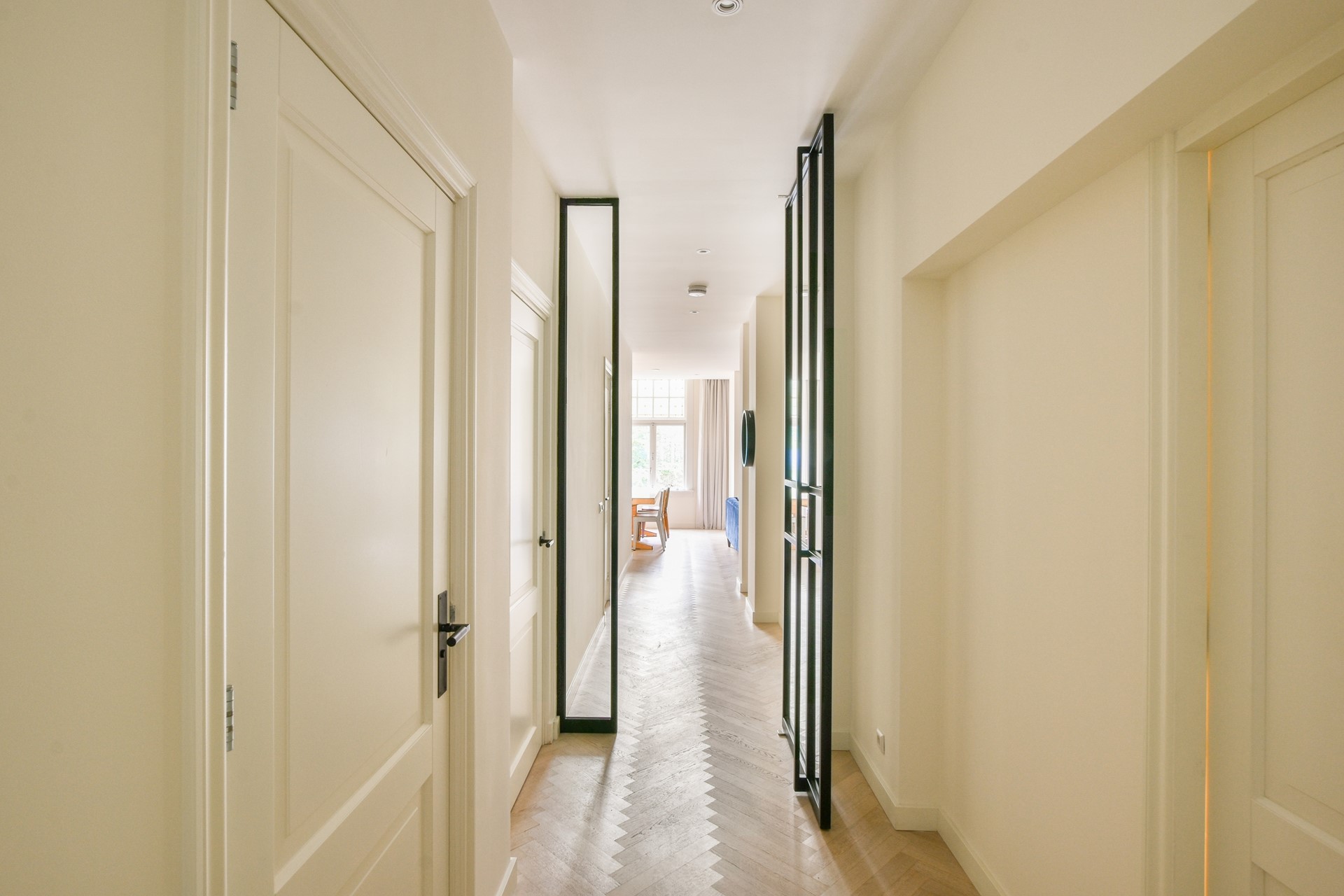 Access to the apartment is via the stairwell, leading to the first floor. The hallway provides access to all rooms. At the front, you will find the living room with impressively high ceilings of 3.20 meters, a fireplace, and authentic stained-glass windows. Doors from the living room open onto the south-facing balcony. The open kitchen features a stylish natural stone countertop and high-quality built-in appliances, such as a steam oven and an induction cooktop with integrated ventilation. Additionally, there is an oven, a steam oven, a dishwasher, and a Quooker.
