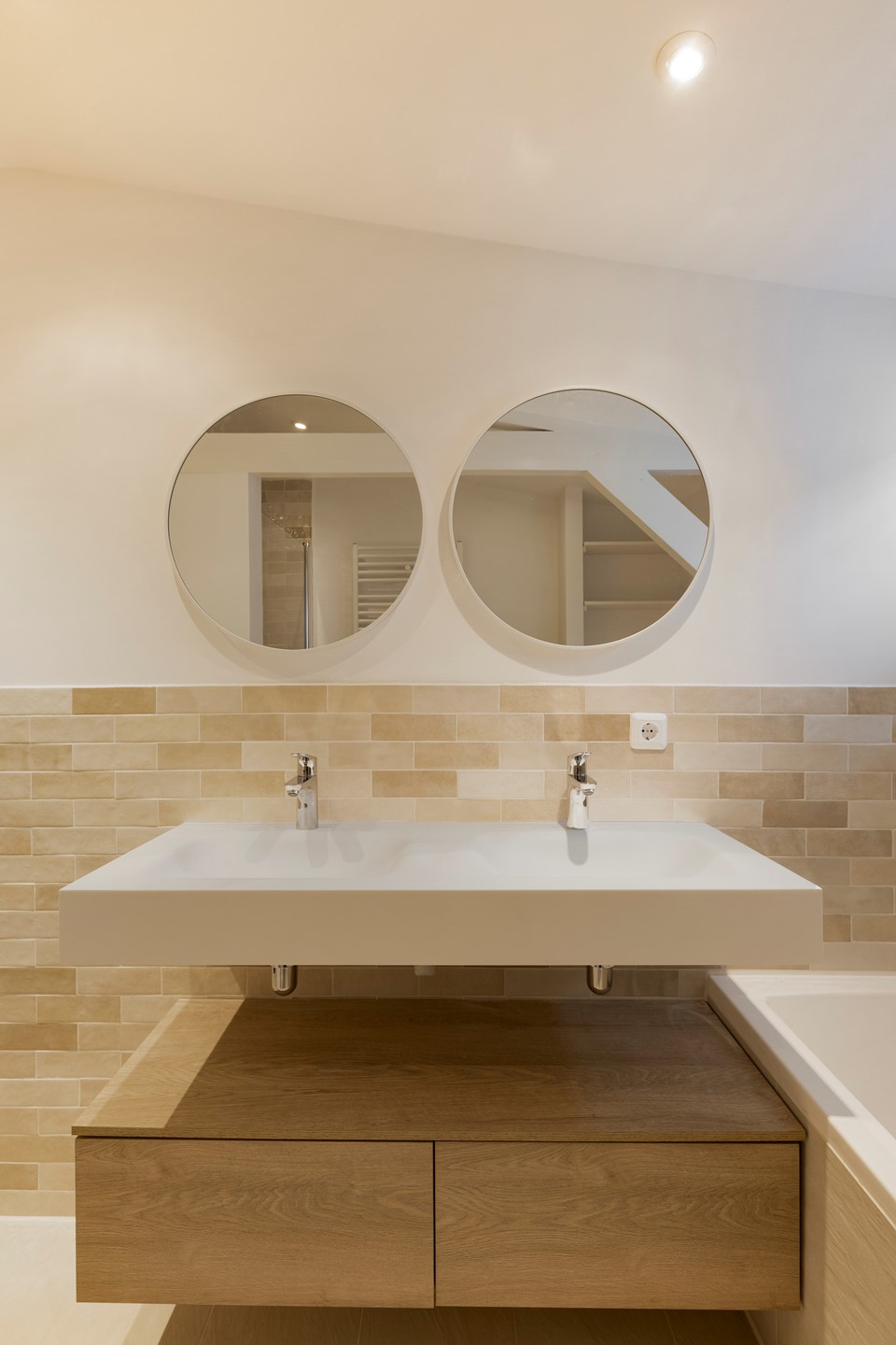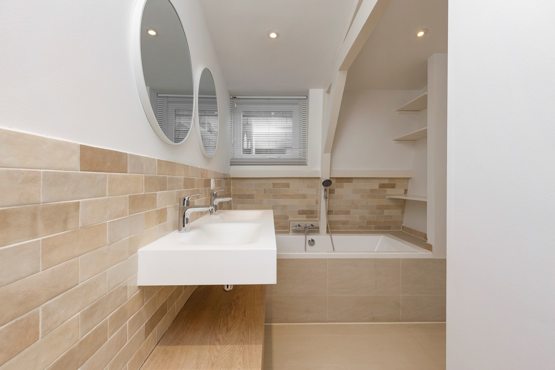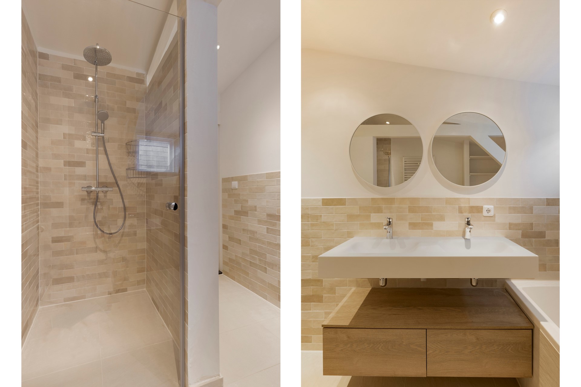 The bathroom is modern, renovated and has a nice bathtub, a separate shower and a sink.