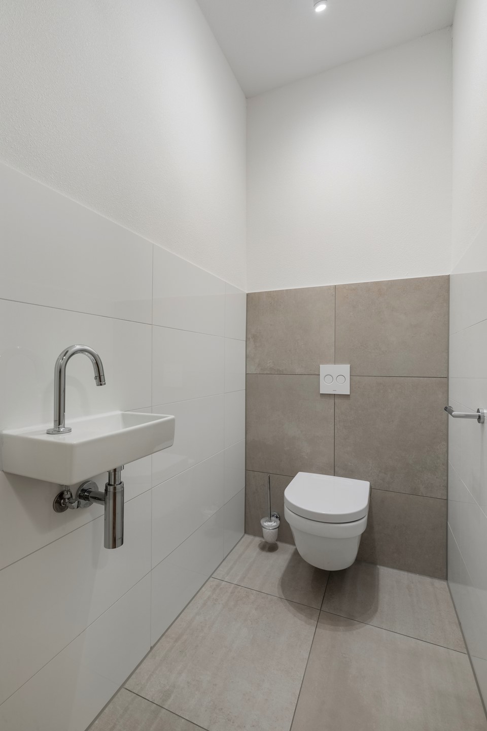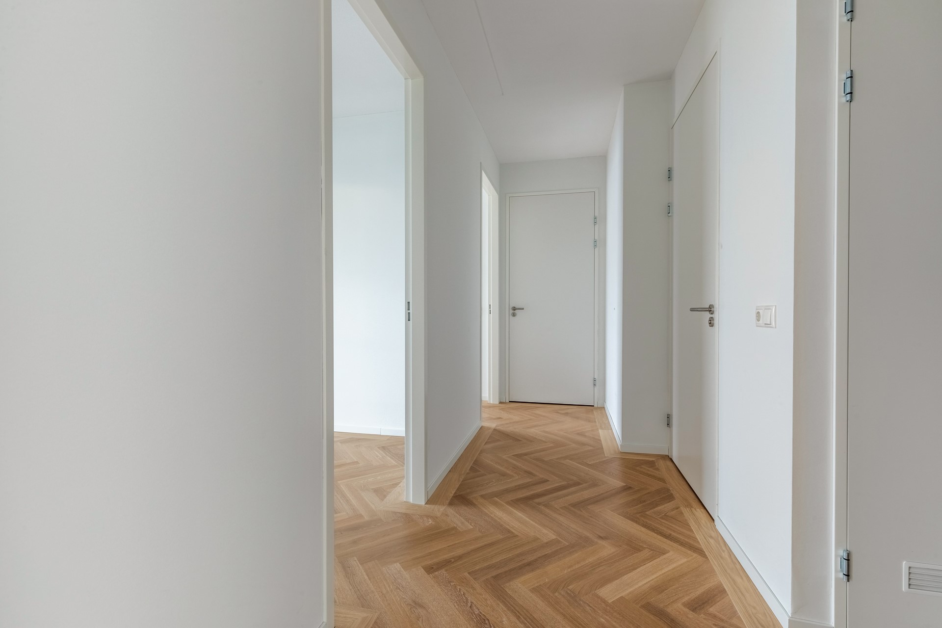 One enters the apartment in a small hallway that connects to all the rooms. There is a storage room, a separate toilet, a bathroom, 2 bedrooms and a living room with open plan kitchen.