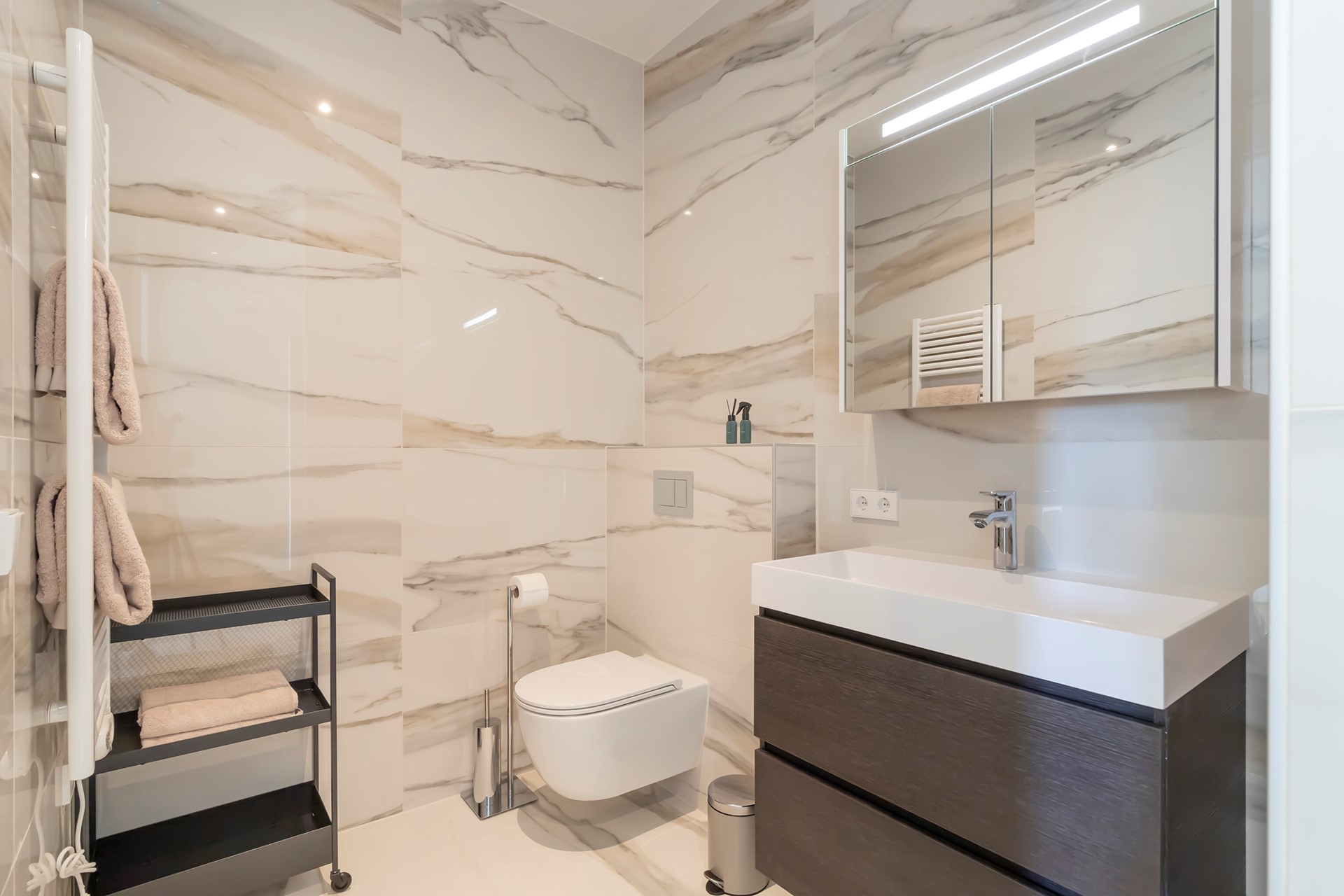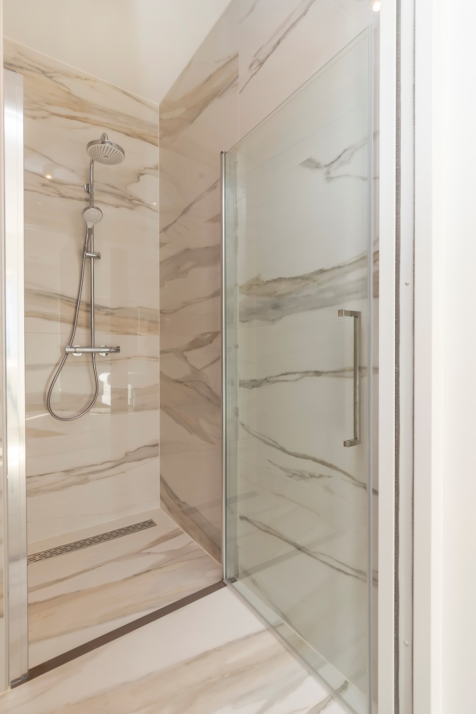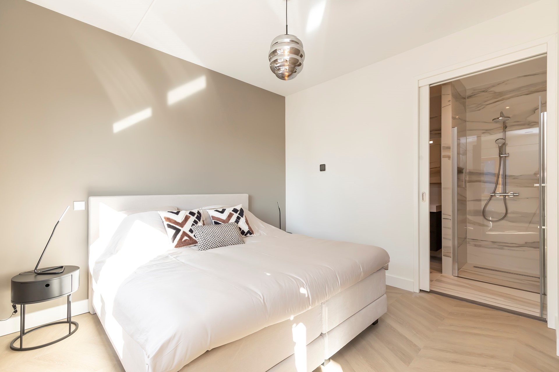 There is a luxurious bathroom connected with the bedroom. The bathroom is equipped with a walk-in shower, second toilet, washbasin with storage and towel radiator.