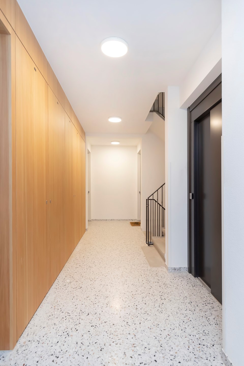 Private entrance, hallway with wardrobe space and separate guest toilet with fountain.