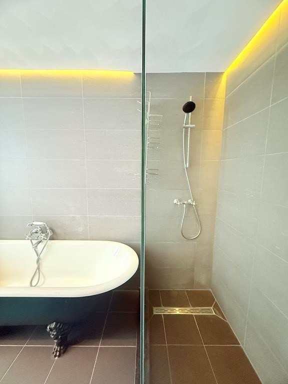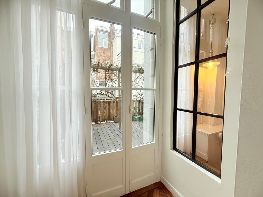 The top floor is dedicated to the master bedroom, complete with a generous built-in wardrobe and a luxurious bathroom with a walk-in shower, bathtub, and toilet. From this floor, you can step directly onto the impressive rooftop terrace, offering open views across the surrounding Amsterdam rooftops. There is lots of outdoor space which is a rare and special feature.