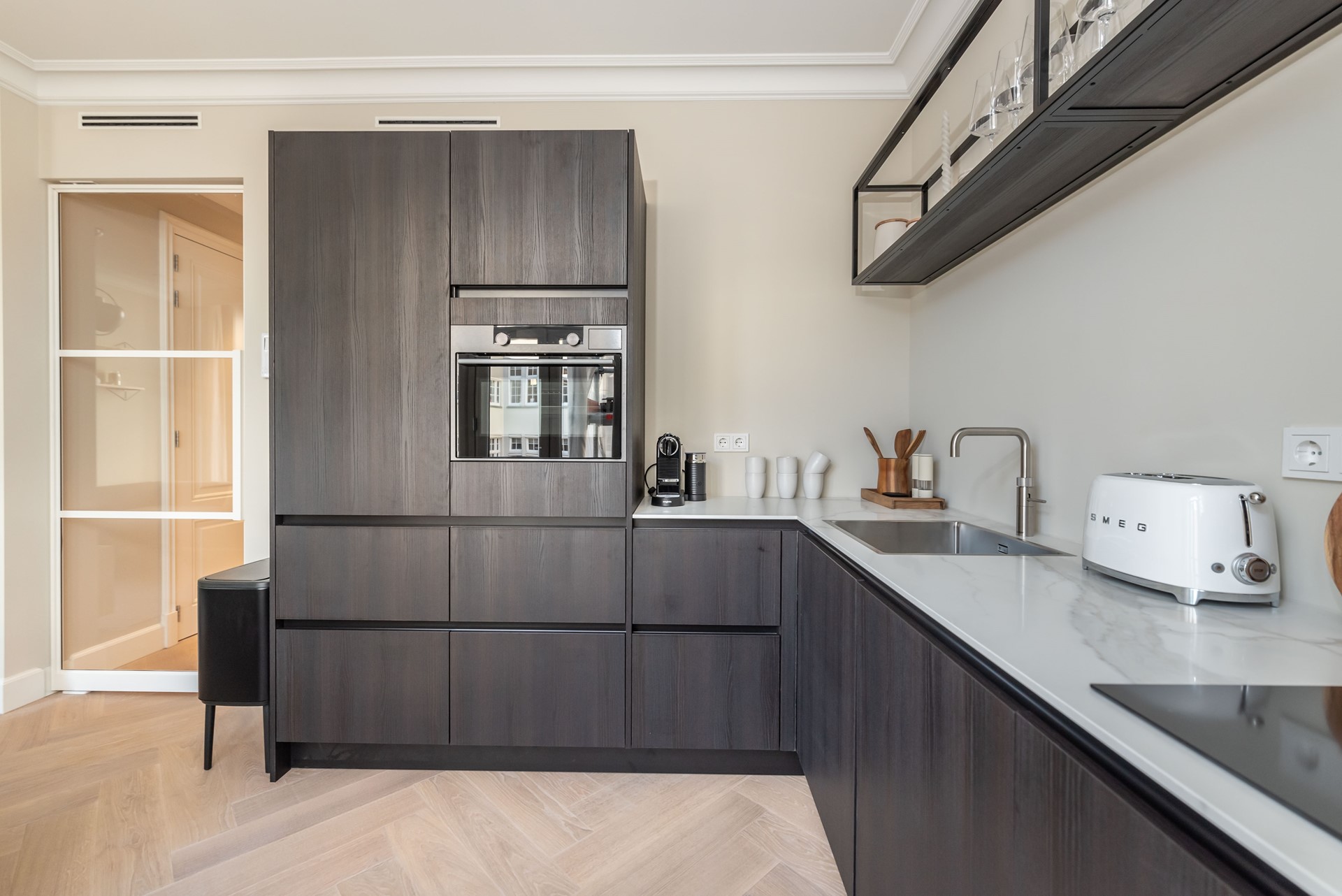 A beautiful herringbone wooden floor, dimmable built-in lights and beautiful doors with matching door fittings can be found through the entire apartment, giving it an overall lush and warm feel.