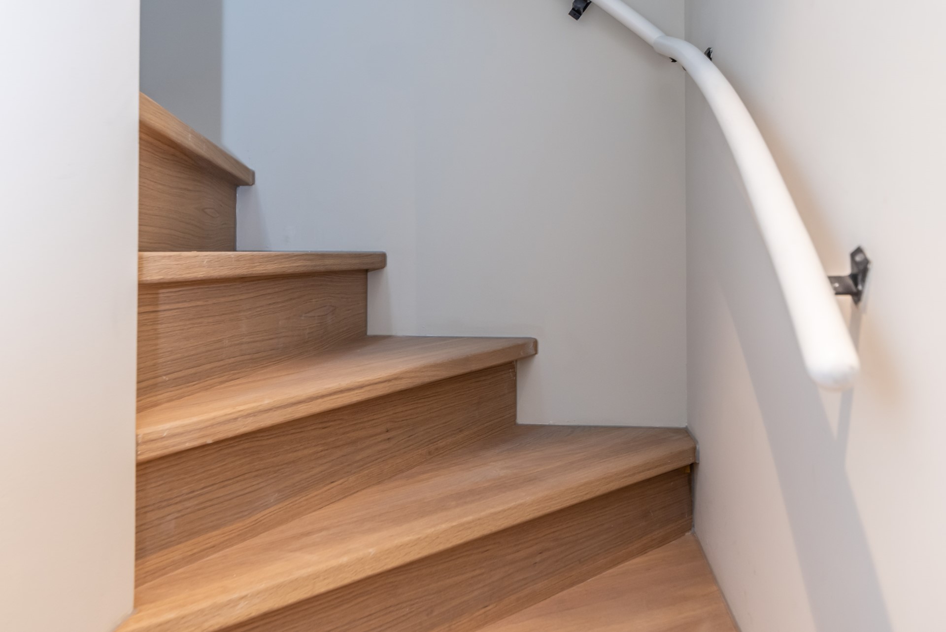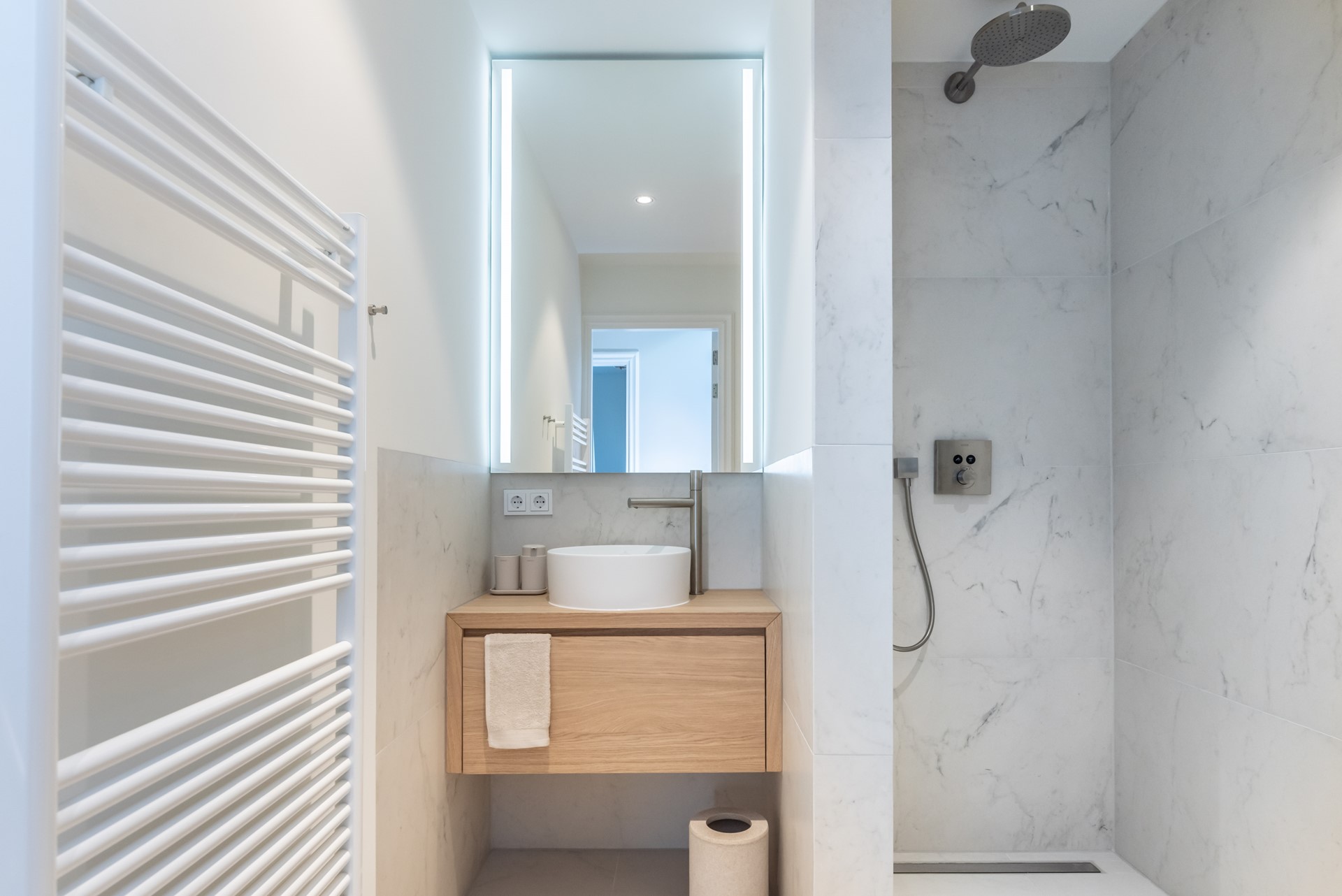 The bathroom is also situated on this level of the apartment. It has a modern washbasin with cabinet, a toilet, a modern shower and a towel heater. Like the toilet downstairs, the bathroom is decorated with the same marble tiles. Next to the bathroom there’s a separate laundry room with a washing / dryer combo.
