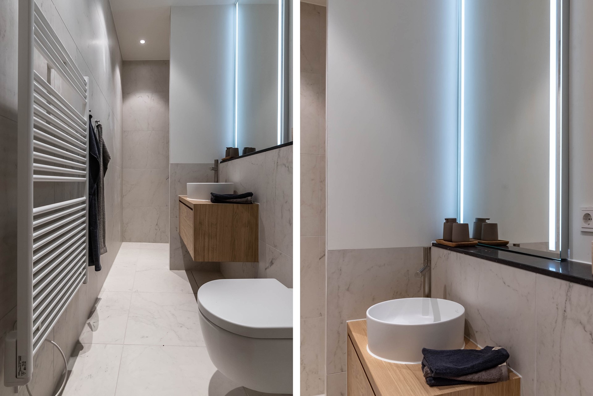 The bathroom is also situated on this level of the apartment. It has a modern washbasin with cabinet, a toilet, a modern shower and a towel heater. Like the separate toilet, the bathroom is decorated with the same marble tiles. Next to the bathroom there’s a separate laundry room with a washing / dryer combo.