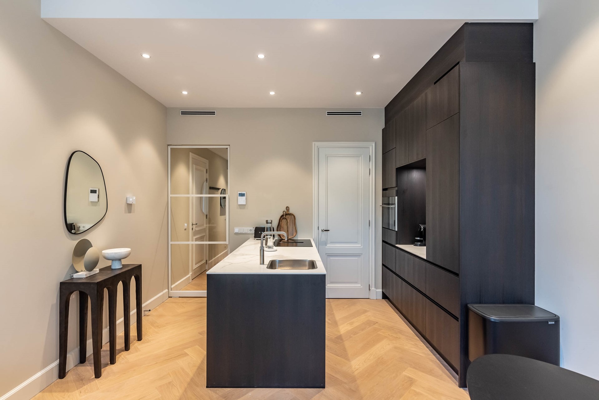 A beautiful herringbone wooden floor, dimmable built-in lights and beautiful doors with matching door fittings can be found through the entire apartment, giving it an overall lush and warm feel.