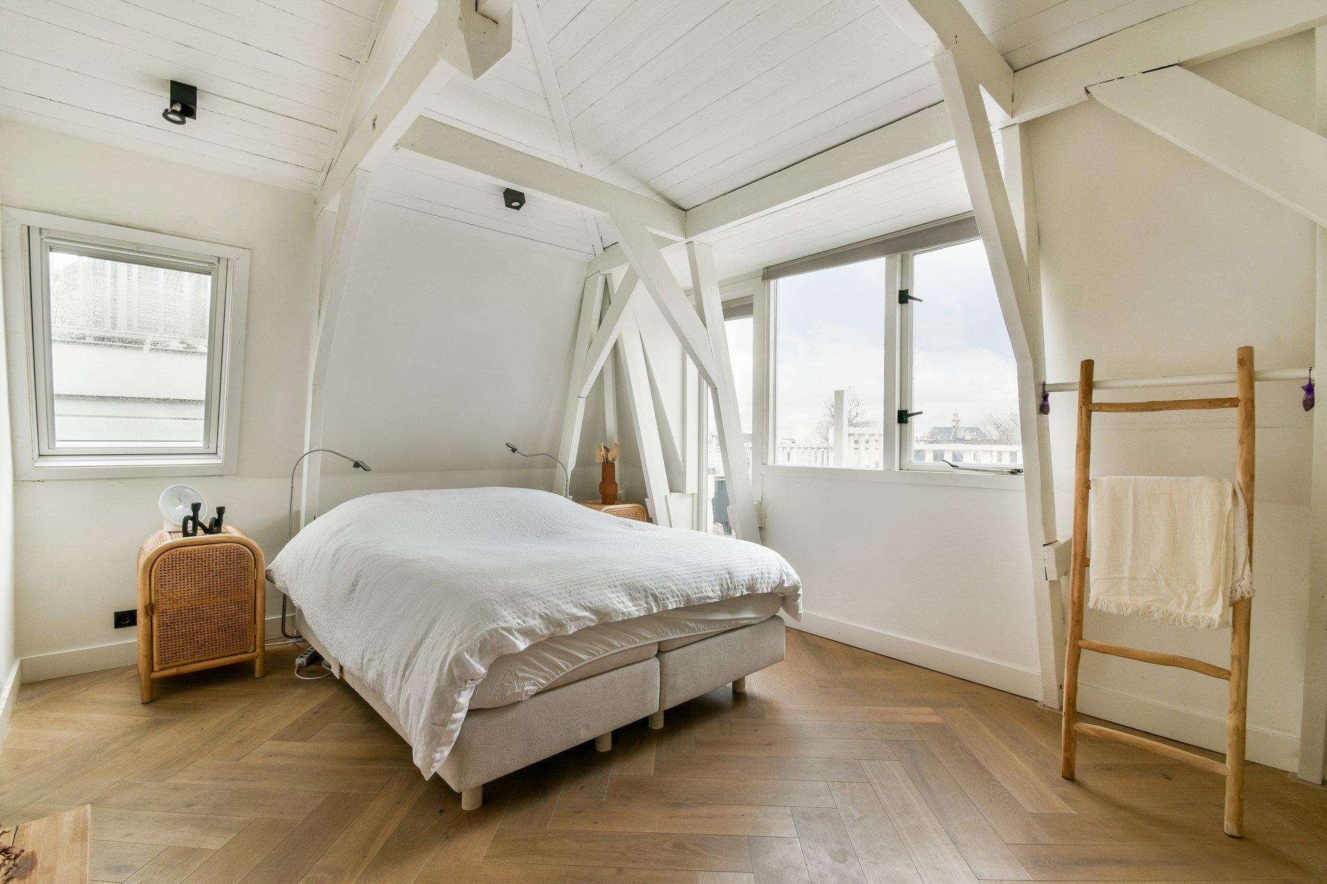 The elegant internal staircase leads to the fourth floor, where you'll find a very spacious master bedroom with a custom built-in wardrobe and a beautiful, modern bathroom with a luxurious feel. From this floor, you have access to the absolute showpiece of the apartment: a sunny roof terrace of almost 20 m², where you can peacefully enjoy the sun, the Amsterdam skyline, and the impressive city views.
