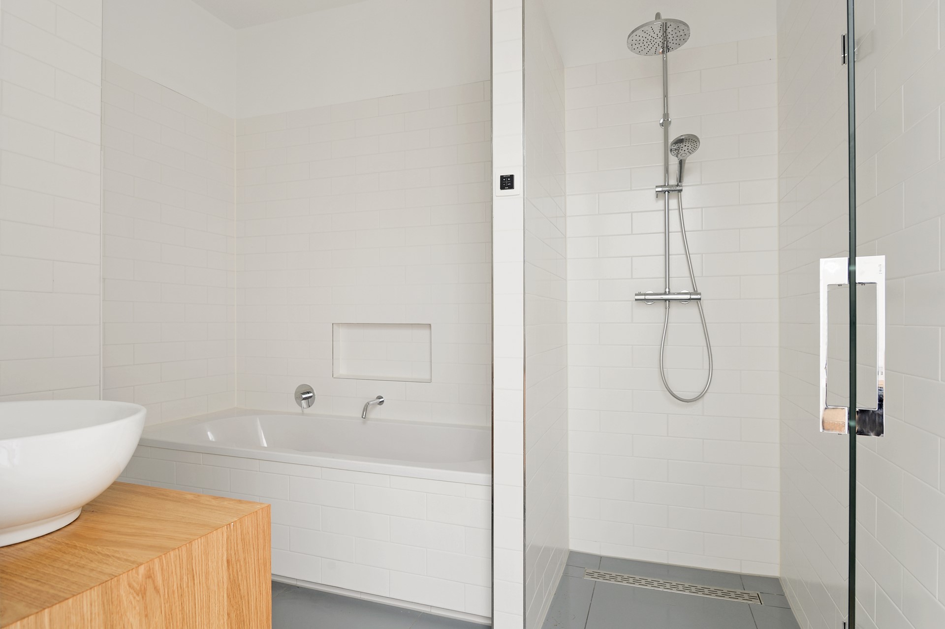 The second luxurious bathroom is equipped with a bathtub, large walk-in rain shower, washbasin and a towel radiator.
