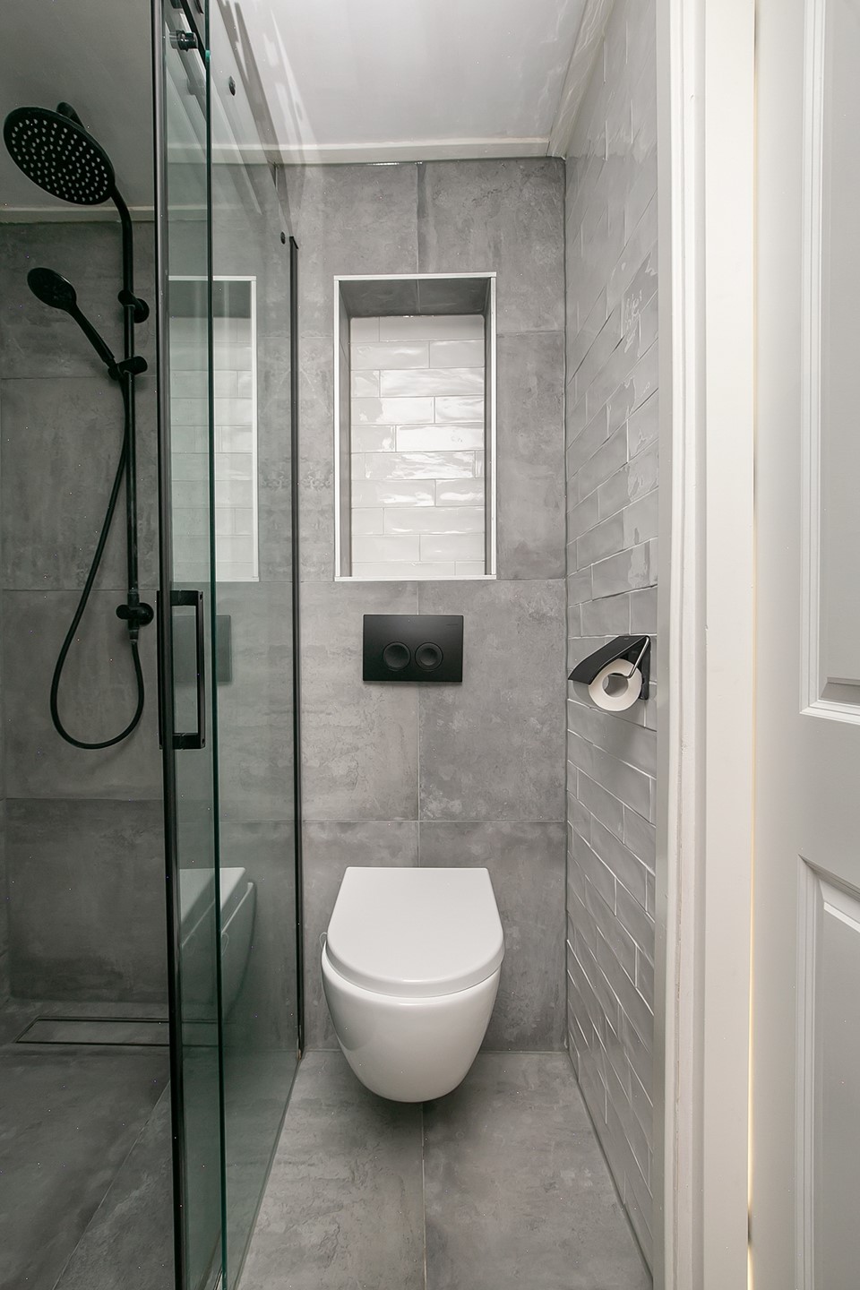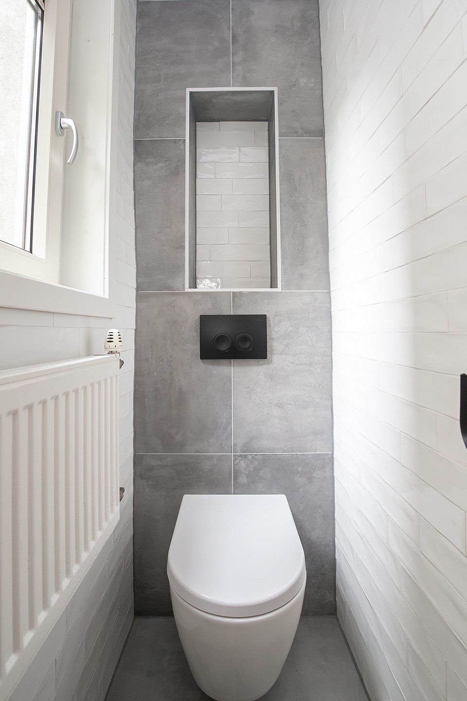 Modern bathroom with underfloor heating, shower, toilet and washbasin with double sink.