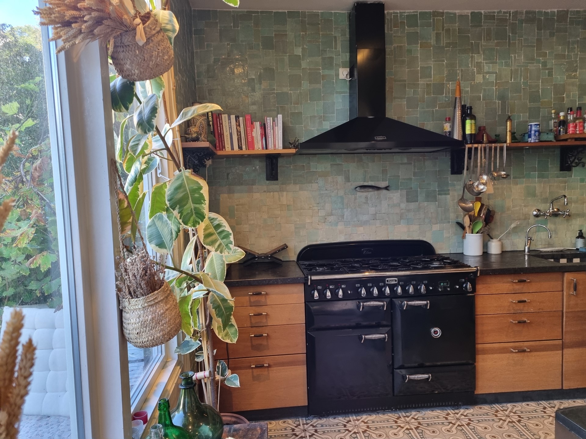 The kitchen is a dream for cooking enthusiasts – featuring a Falcon range oven, marble countertops, bespoke cabinetry, open shelving, and high-spec appliances, including a large American-style fridge/freezer. Stylish tiles and wooden finishes create a warm, artisanal feel. From the rear seating space, elegant doors open onto a private terrace overlooking the garden, creating a tranquil backdrop.