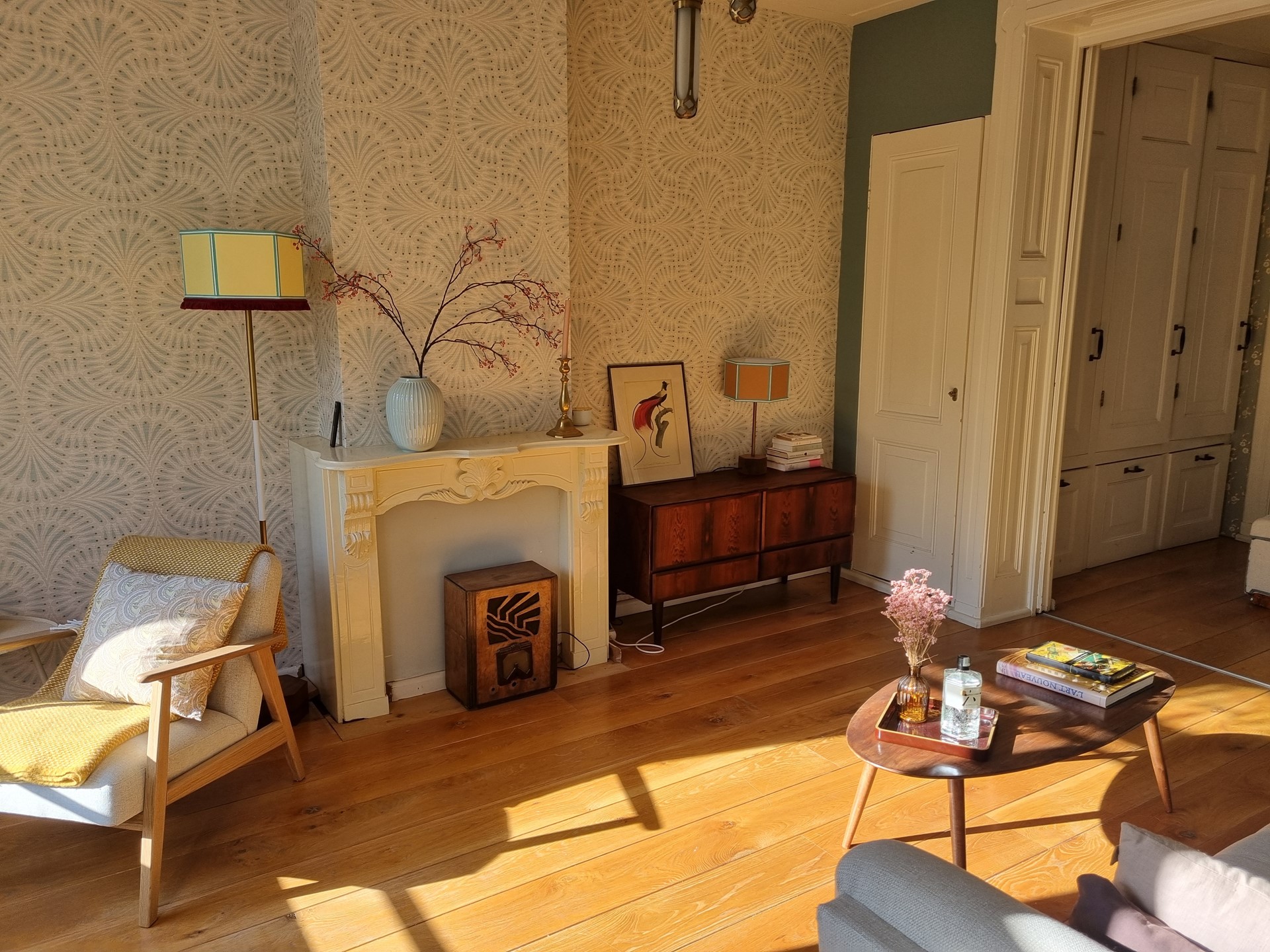 The main living level unfolds with solid wooden flooring, a marble fireplace, original stained-glass windows and beautifully considered furniture and lighting. Soft morning light filters through coloured glass panels, giving the space a gentle artistic ambience.