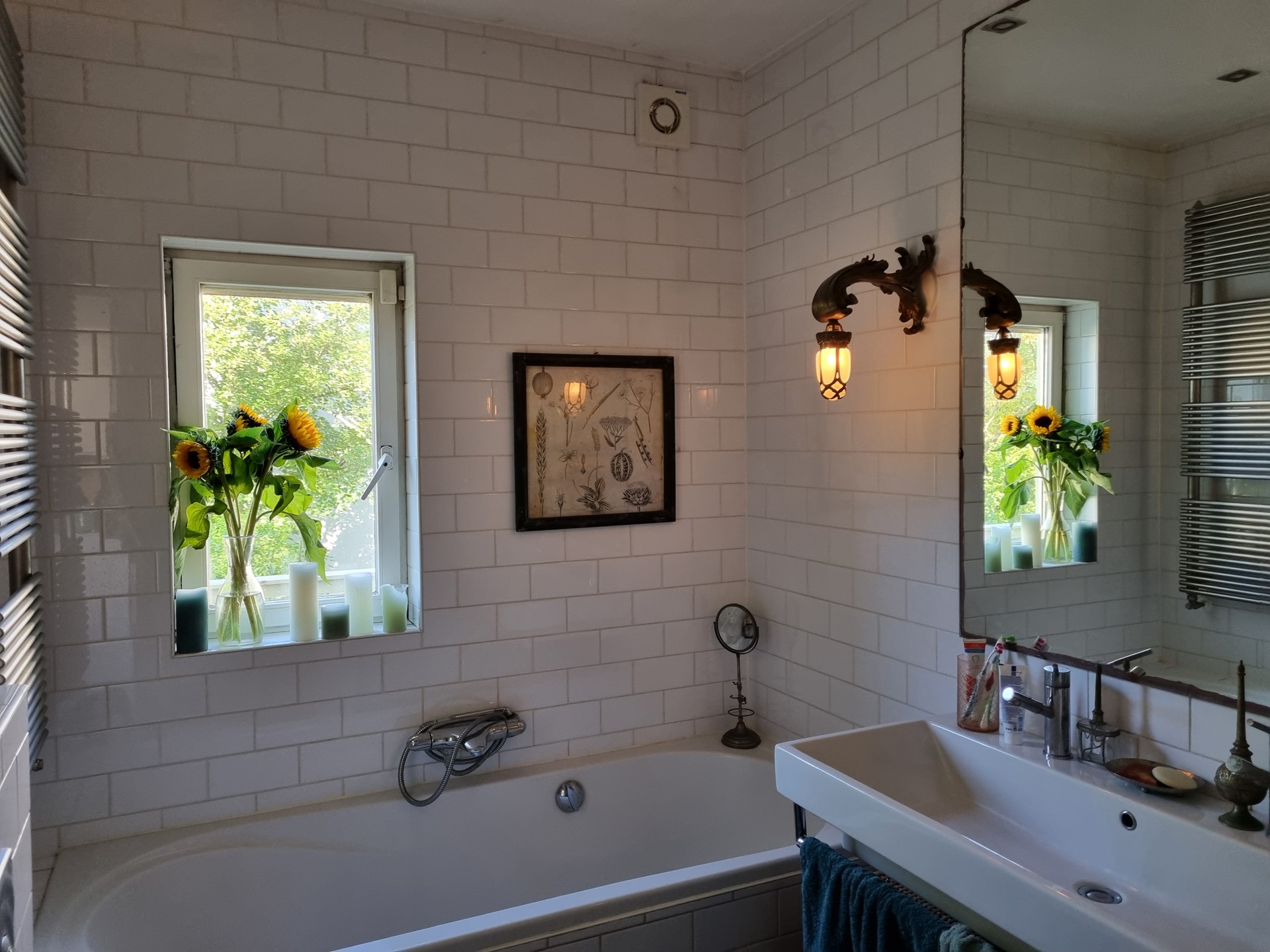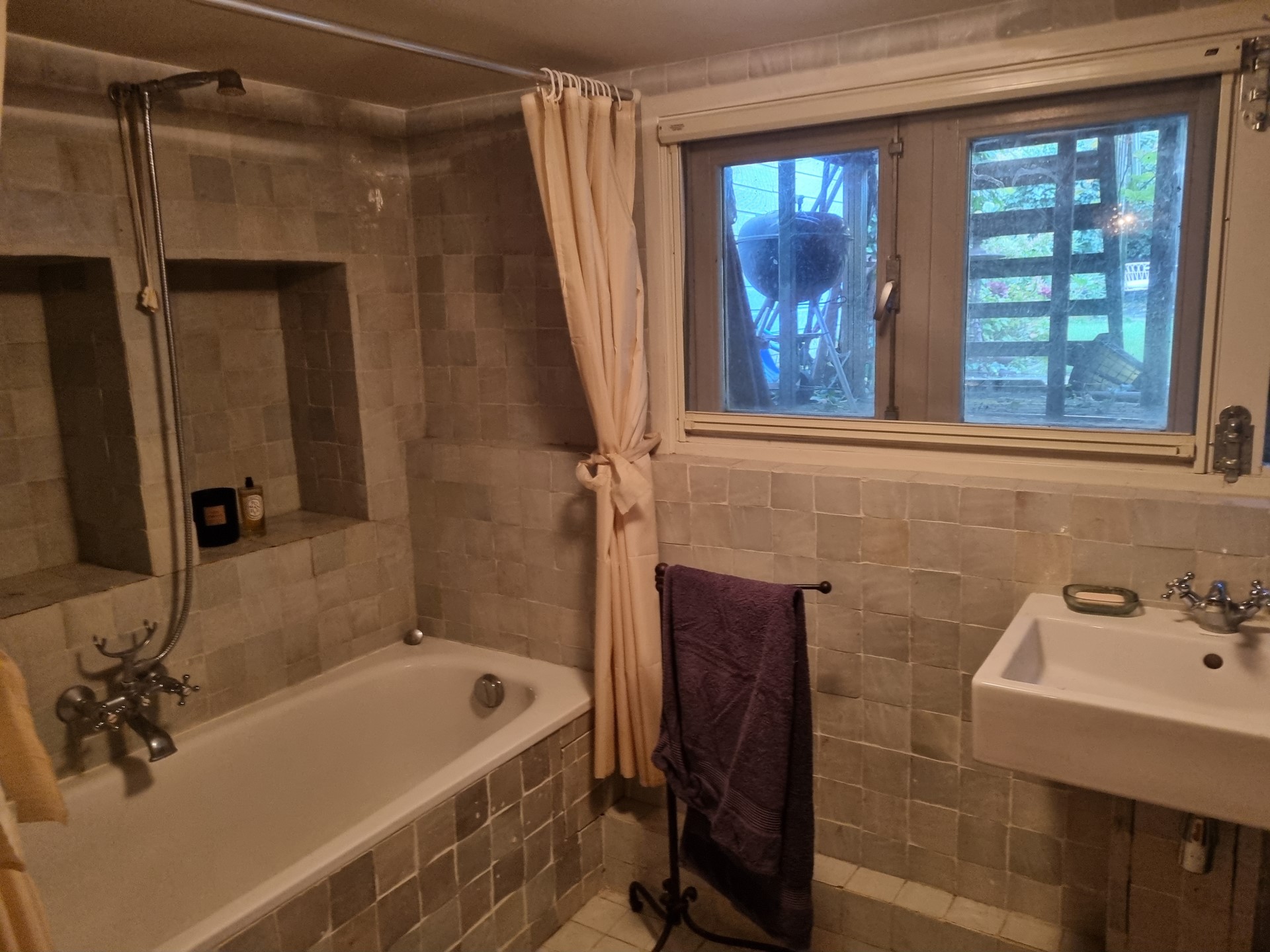 • Beautiful ensuite bathroom with a garden-view window, large bathtub, walk-in shower, and characterful feature sink