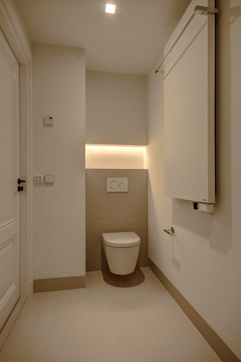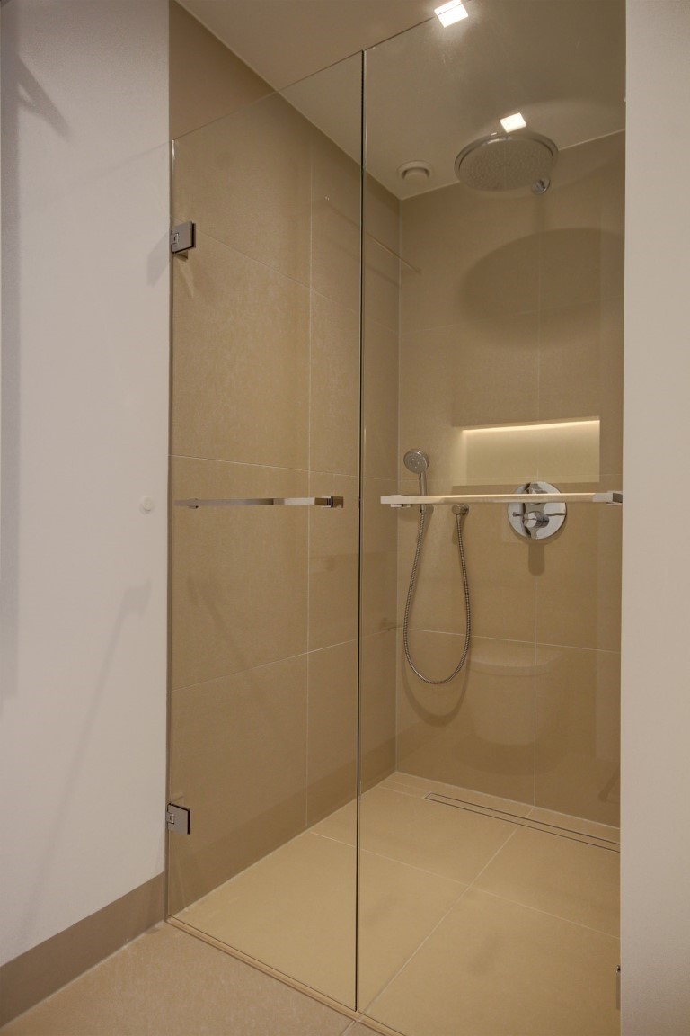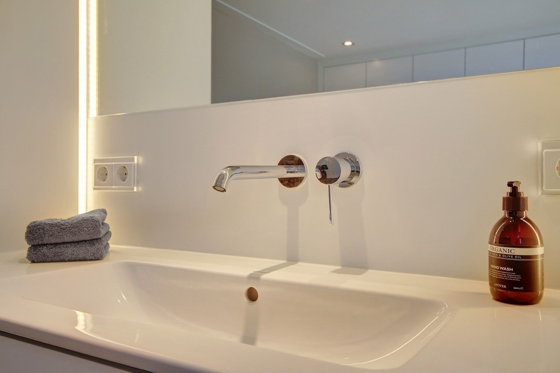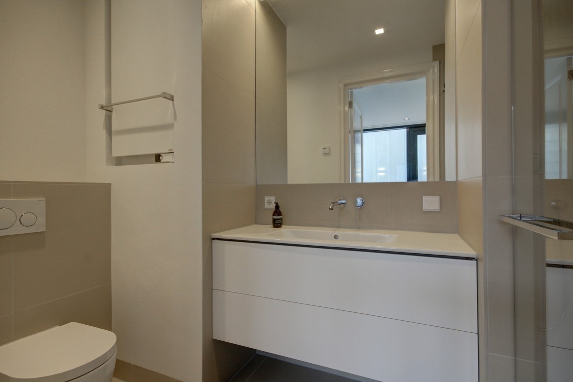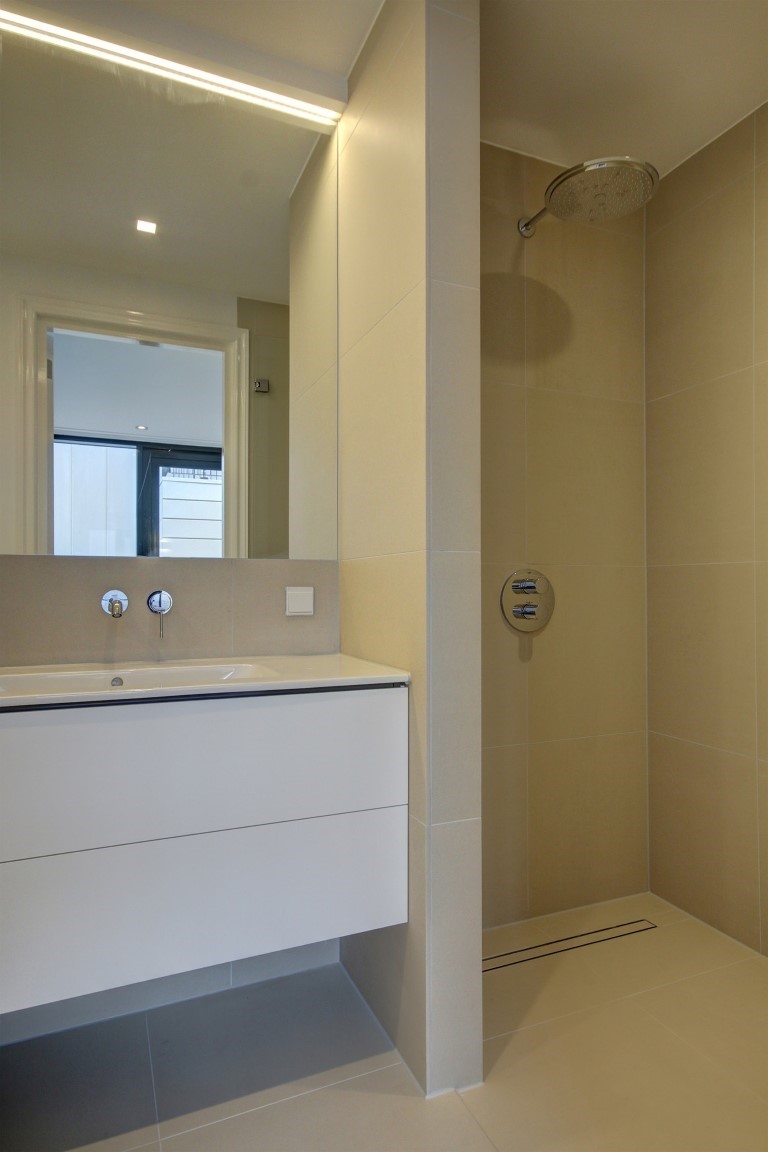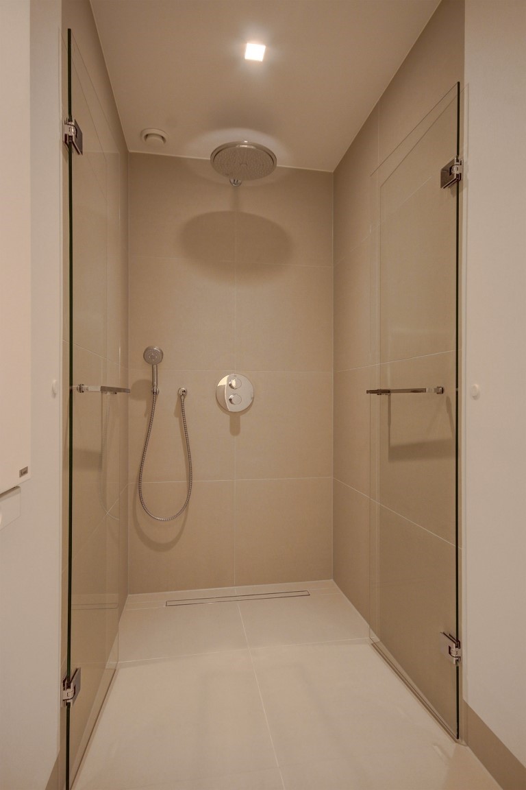Hallway to the back with doors to the 2 well sized bedrooms with build-in wardrobes, and both have en-suite quality bathrooms with walk-in rain shower, large basin and toilet. The bedroom closest to the living offers a terrace facing North East, and the master bedroom on the back has a stunning glass wall towards the monumental façade and garden of the underlying building.