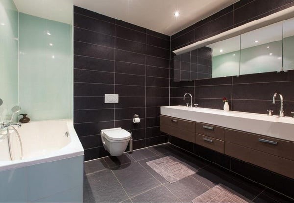 * Bathroom with bathtub, walk-in shower, double wash basin and toilet