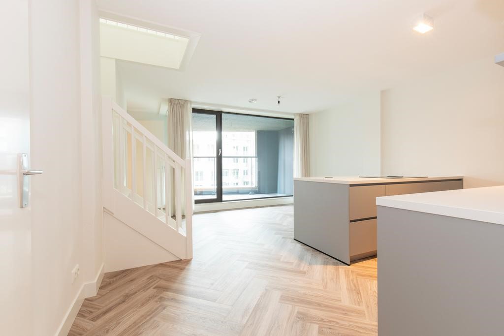 Stunning double apartment of approx 201 m2 for rent in the amazing VERTICAL building (2022) This unfurnished apartment is equipped with 3 bedrooms, 2 bathrooms (1 with bath), 1 home office, balcony, luxurious kitchen including island, a spacious living room of almost 70 m2, PVC floor heated and cooled floor throughout. All brand new with an energy label A++.