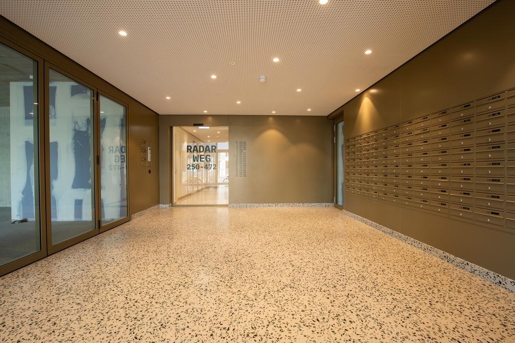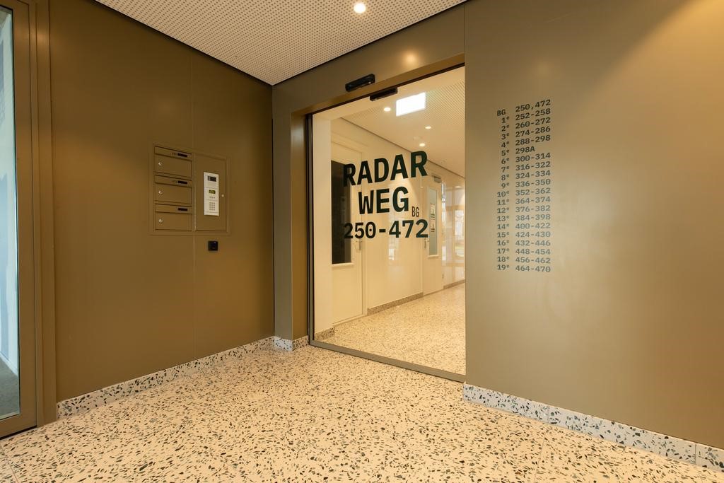Communal entrance with mailboxes, stairwell and elevators with access to the parking garage and bicycle shed.