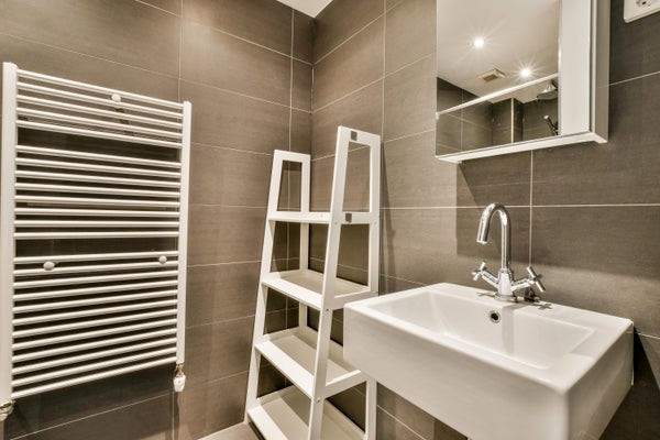 The centrally located luxury bathroom features a spacious shower, double washbasin with vanity unit, and towel radiator. Separate toilet.