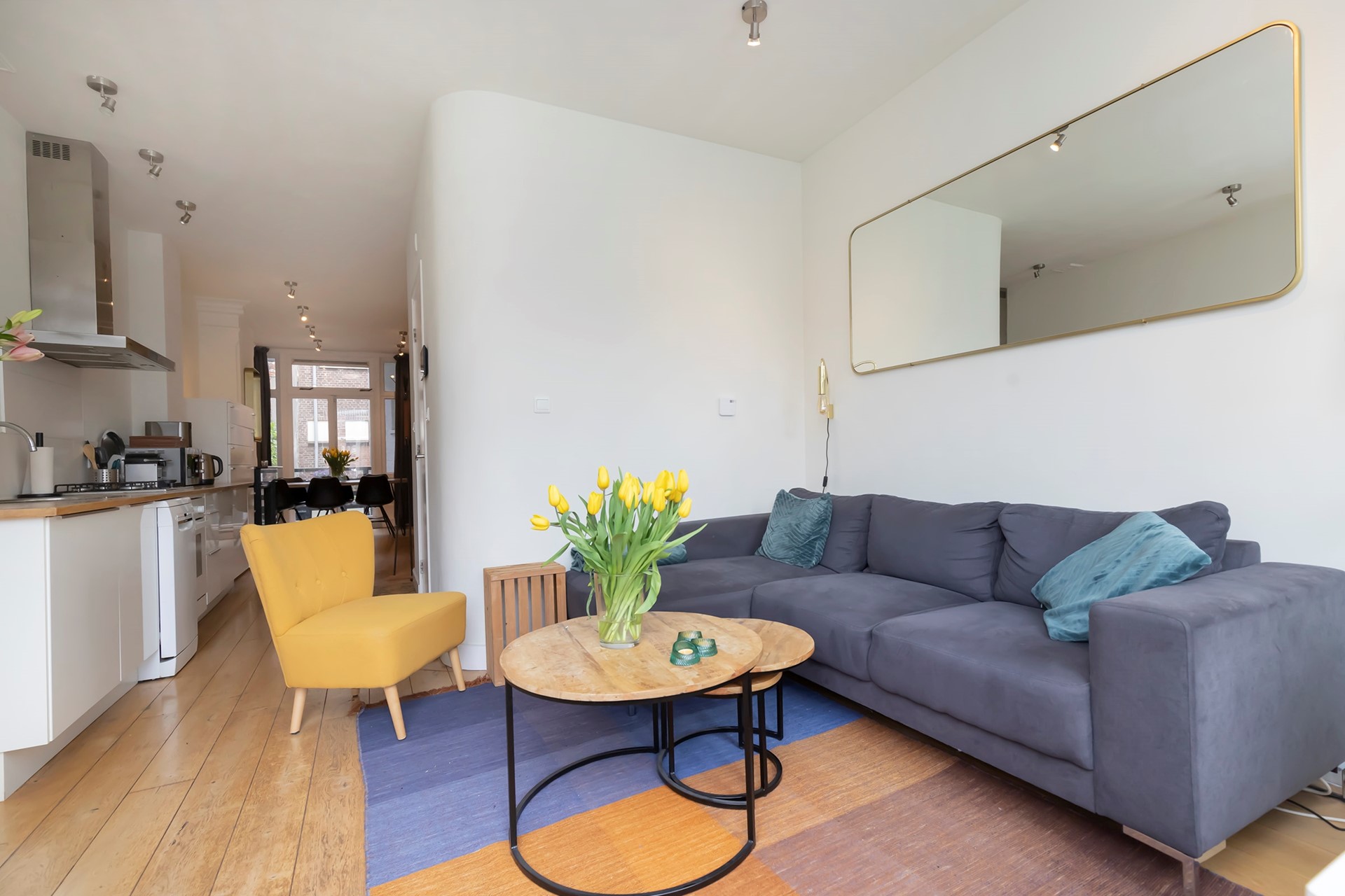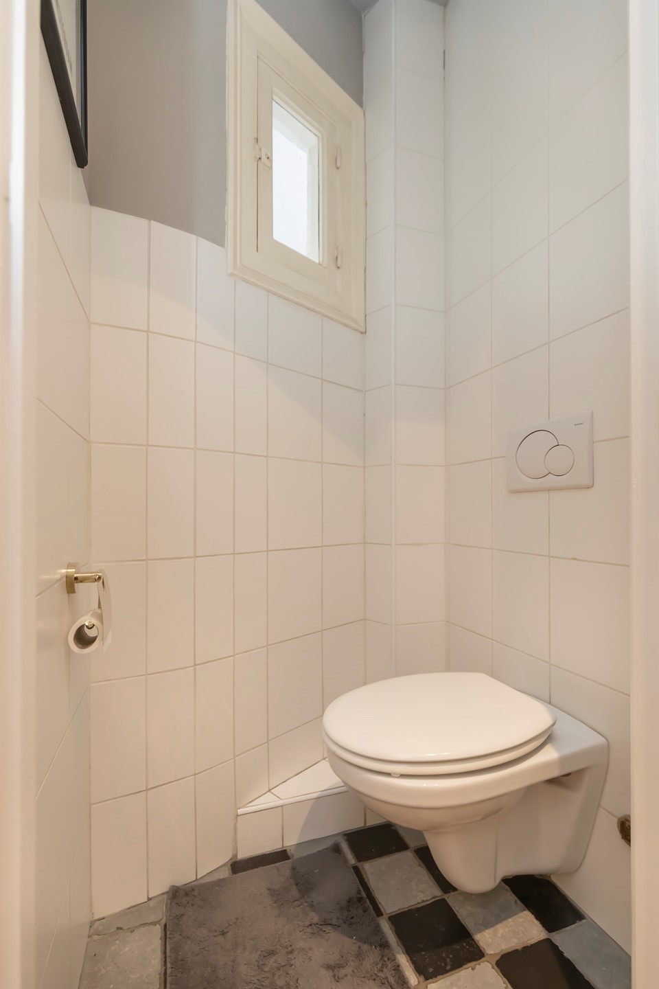 The living space is situated at the front side, with a beautiful view over the canal through the two large windows. Both windows can be opened and you can sit on the windowsill, enjoying the afternoon sun.
