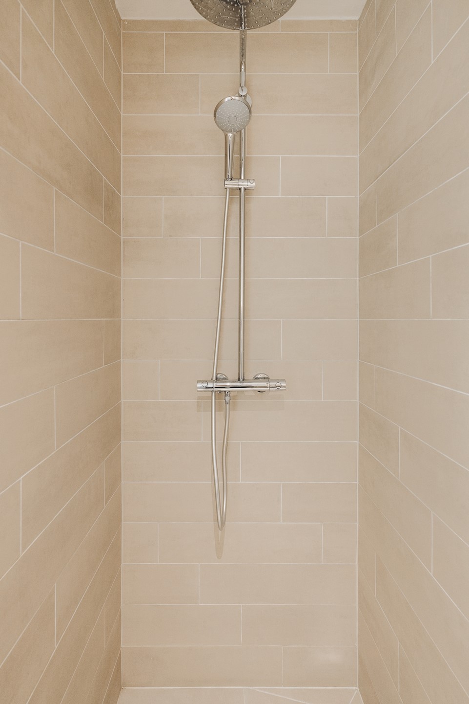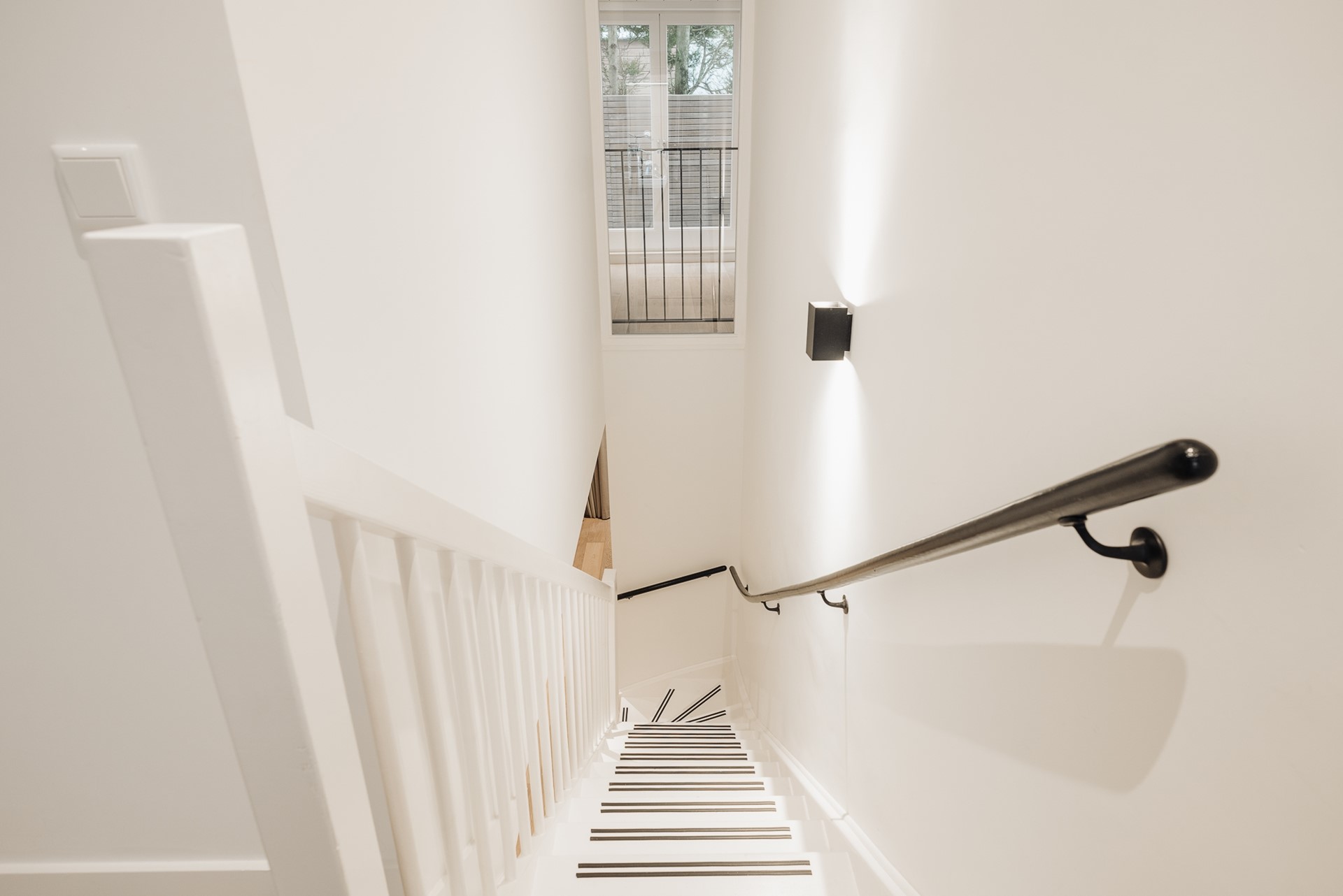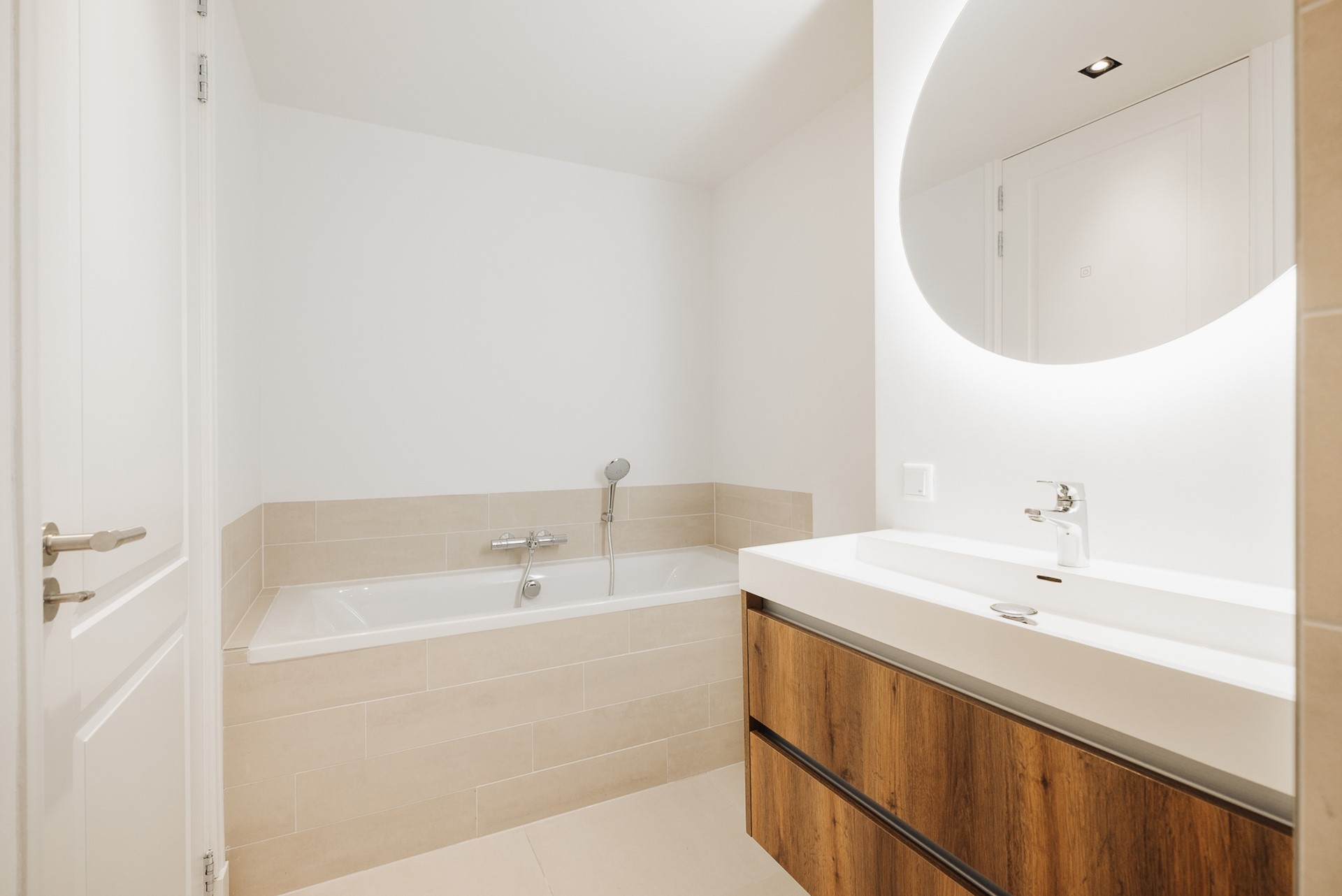 Hallway to sunny living kitchen with combi microwave oven, induction stove, dishwasher and extractor fan. Spacious living room with wooden floor at the rear of the apartment, with access to tiled courtyard. Stairs to souterrain with 3 bedrooms, 1 very spacious. Bathroom with walk in shower, bathtub, towel radiator, and sink with mirror. Separate toilet, laundry room and extra storage.