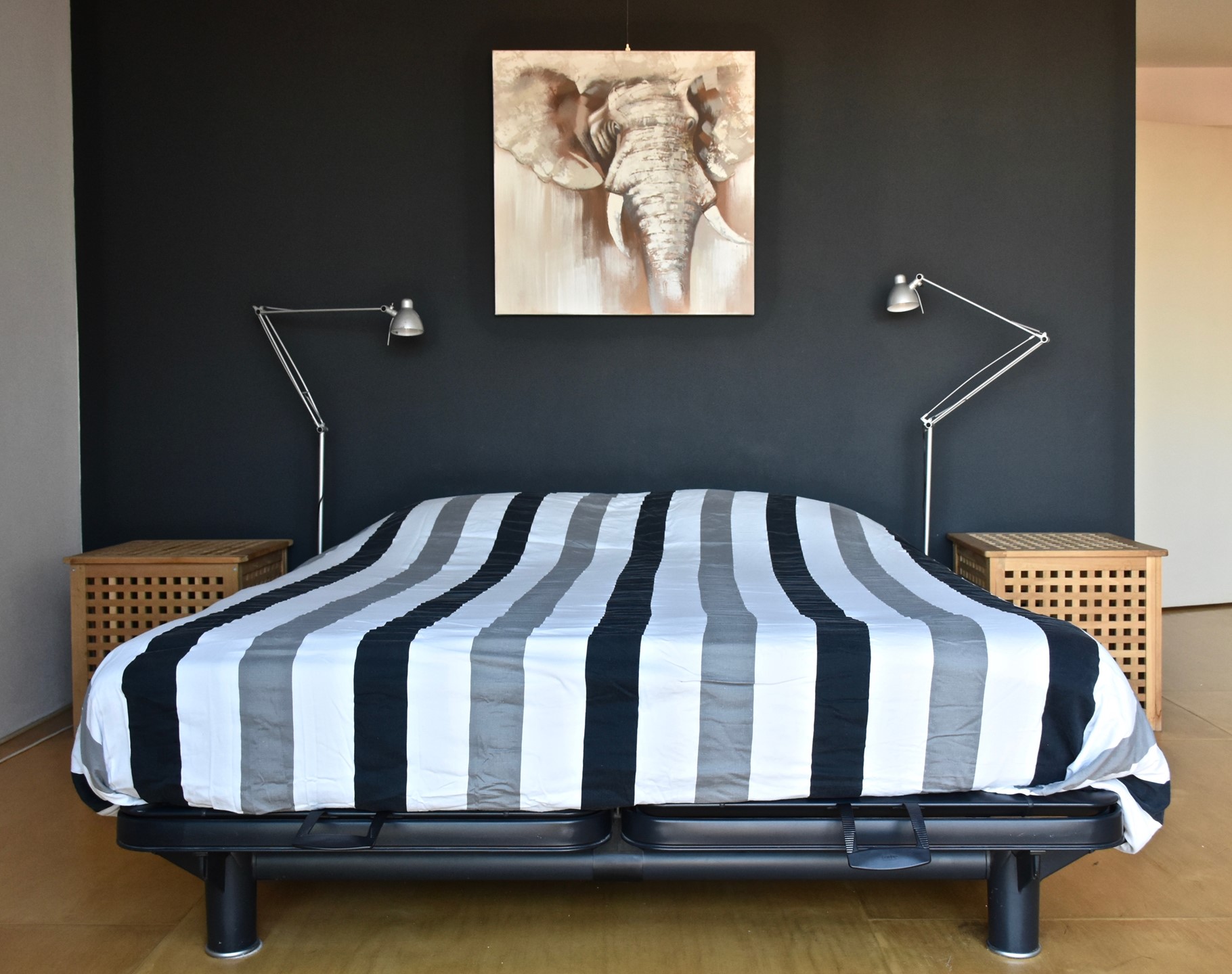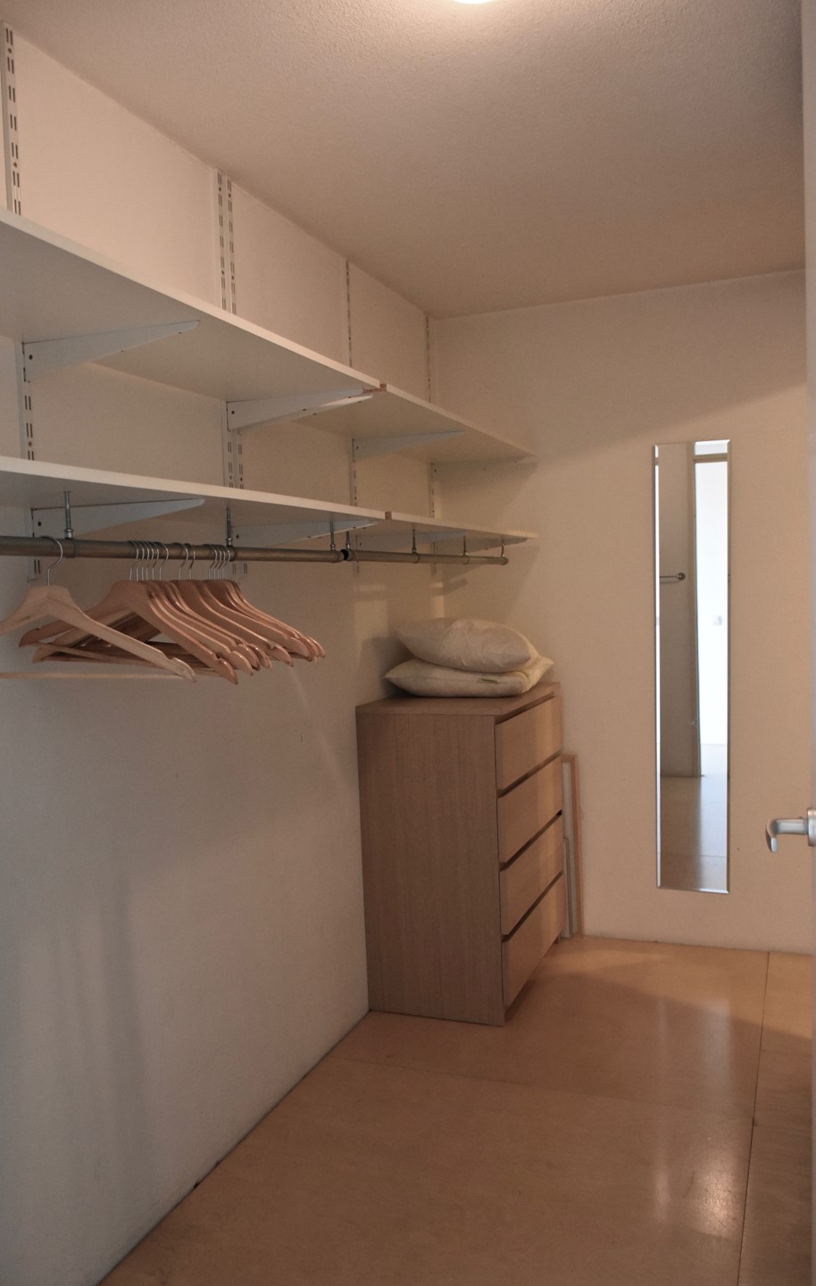 The living room is exceptionally bright thanks to the large windows offering a beautiful view over the Schinkel and the city. From the living room, there is access to a smaller bedroom furnished with a single bed. At the rear is the master bedroom with a double bed and access to the balcony.