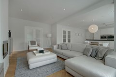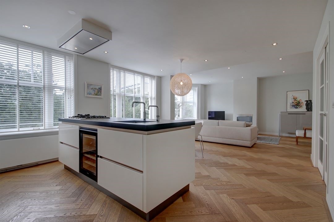 The entrance to the apartment is on the second floor, accessible via the communal staircase. At the front of the property is the bright living room with open kitchen. The modern kitchen is equipped with high-quality built-in appliances, including a refrigerator, wine climate cabinet, induction hob, dishwasher and combi microwave oven.