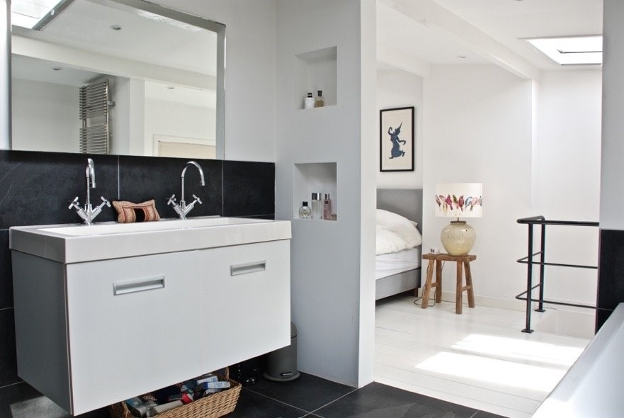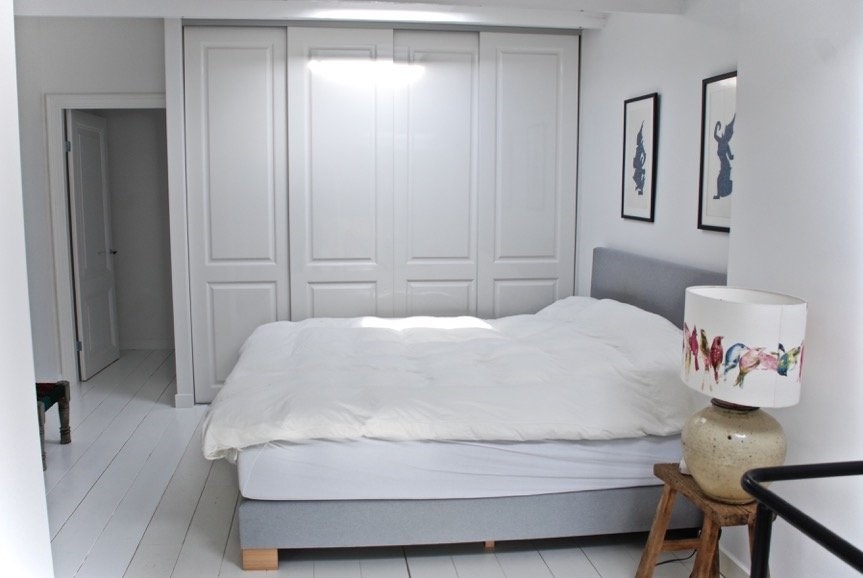 French doors open to the balcony. A spiral staircase leads to the master bedroom with a large built in wardrobe. The bedroom has an open connection with the living room and has a very light and quiet atmosphere. The open luxury bathroom has a walk in shower and a bathtub. From the master bedroom you have access to he second bedroom.