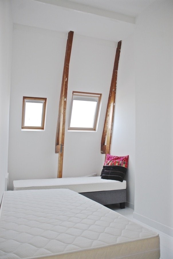 The communal staircase gives access to the apartment on the third floor. In the hallway a separate toilet and closet for the washing machine and dryer. At the front a small bedroom. The living is also at the front of the apartment. The open kitchen is fully equipped.