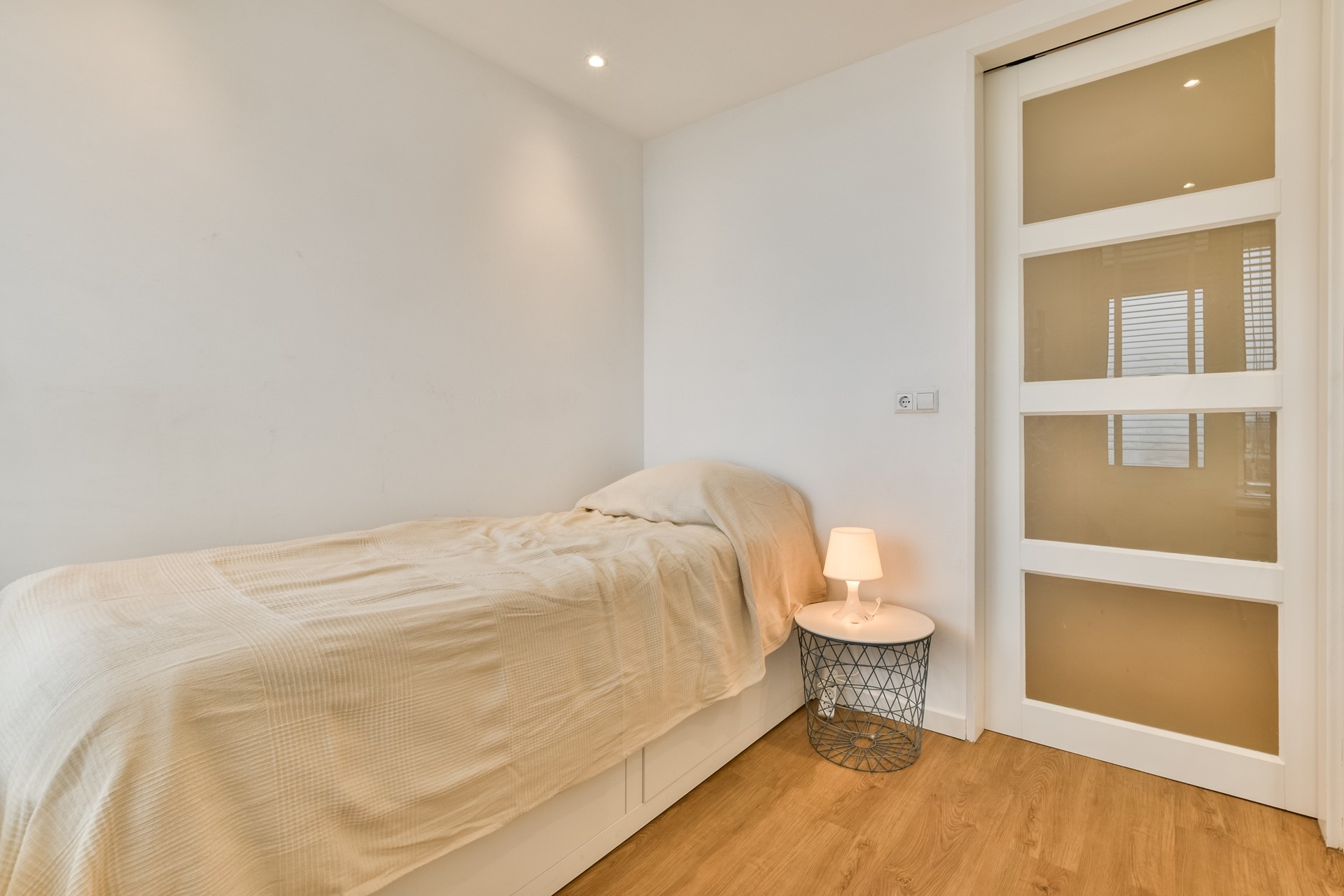 The apartment on the third floor features a modern interior with practical amenities such as an elevator. The open living room with air conditioning has windows on all sides, allowing plenty of natural light. The kitchen is equipped with a kitchen island, refrigerator, dishwasher, induction cooktop, combination oven/microwave, and Quooker. Both bedrooms are accessible via the hallway. The first bedroom has a single bed that can be extended into a double, a desk, and a wardrobe. Both the first bedroom and the living room provide access to the balcony. The master bedroom with air conditioning includes a double bed and built-in wardrobes. The bathroom features a walk-in shower, a double sink with vanity, a washing machine, and dryer. Additionally, there is a storage room on the ground floor.