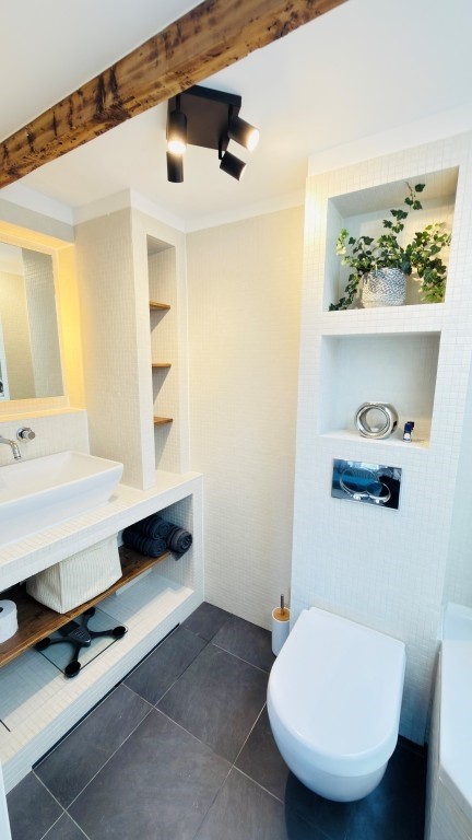 The romantic bedroom is on the top floor with the beam structure showing and can be reached via an internal open staircase. The comfortable bathroom is en-suite and offers a corner tub which is in use as a shower as well, a large basin toilet and sufficient shelving.