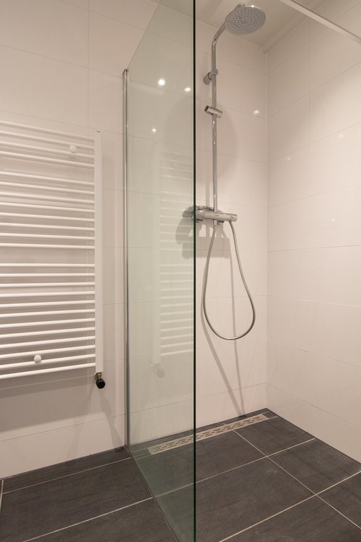 A bathroom with spacious walk-in shower and double sink is located in between living and bedrooms and can be entered in the hallway.