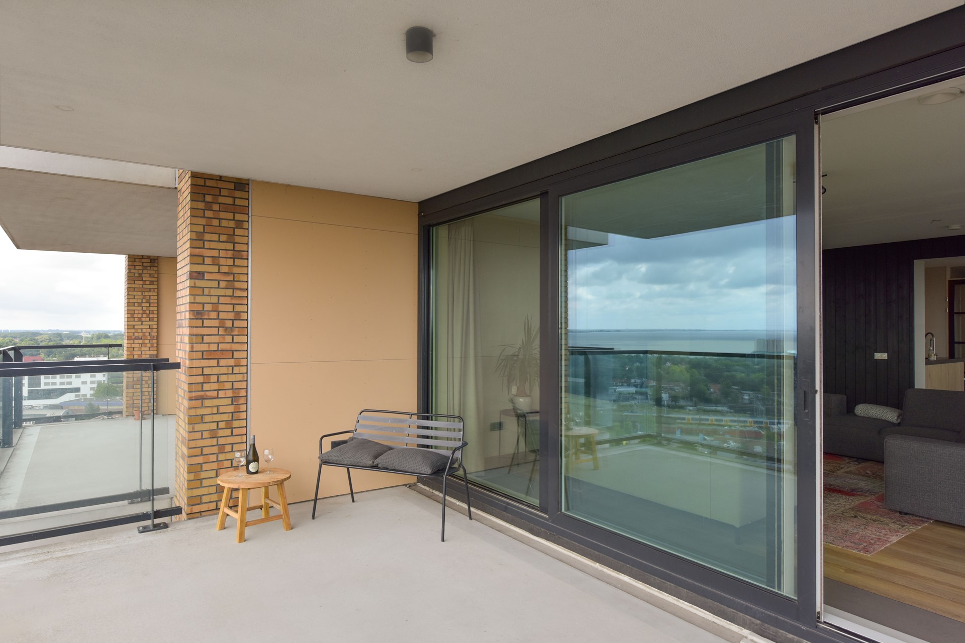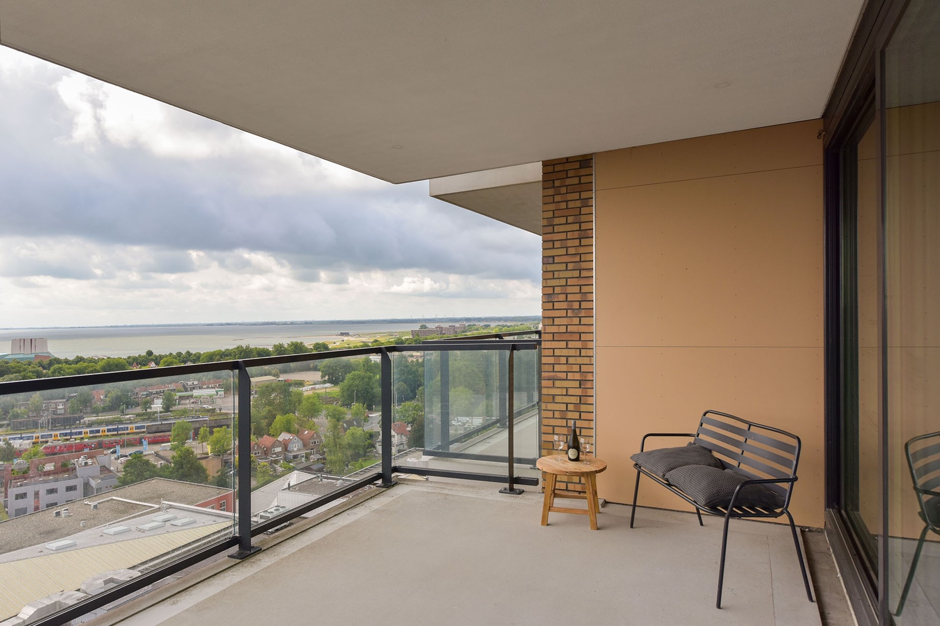 The living room is characterized by the large sliding doors that offer an impressive view over Hoorn. The southeast-facing balcony is a wonderful spot to enjoy a sunny morning or a long summer evening.