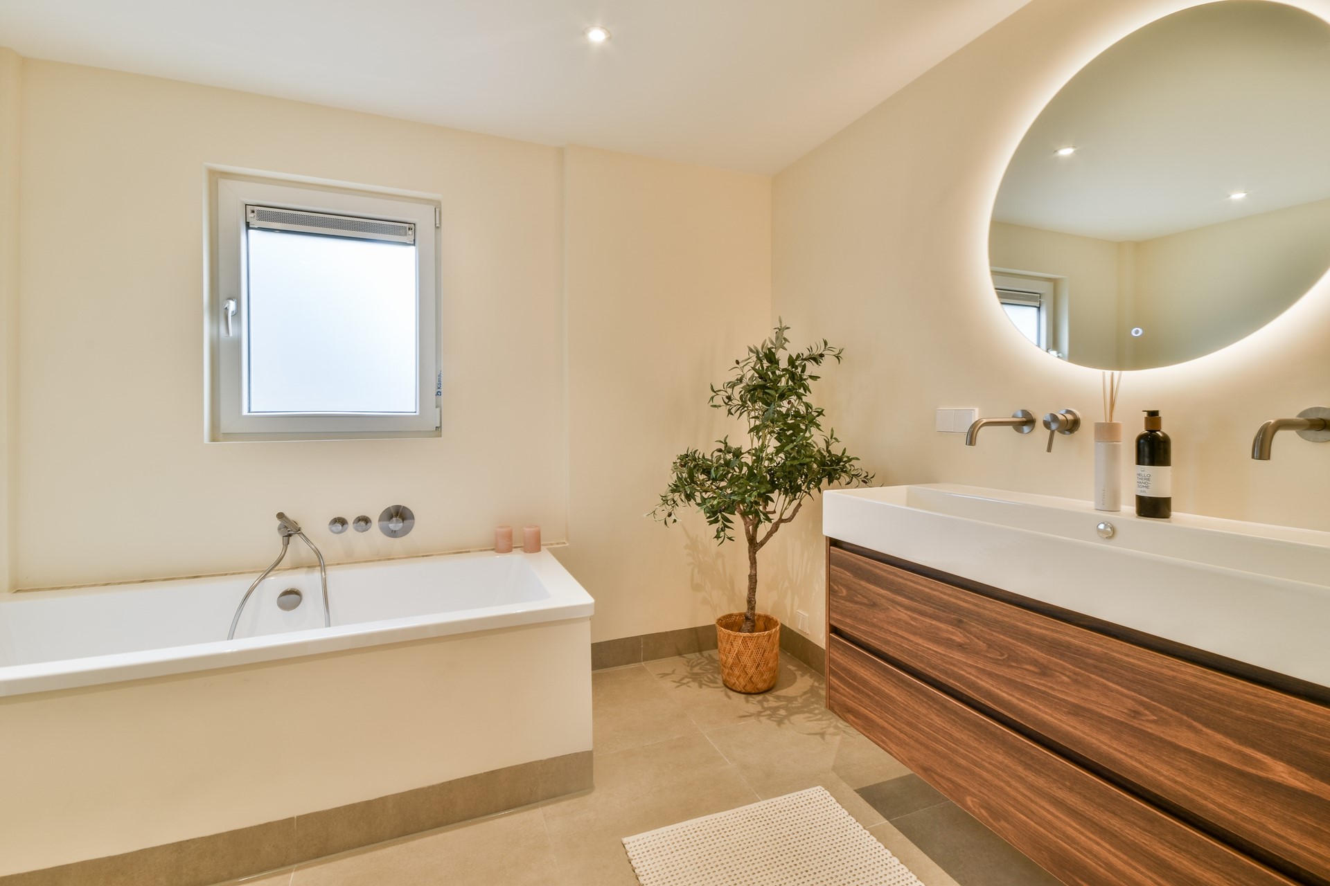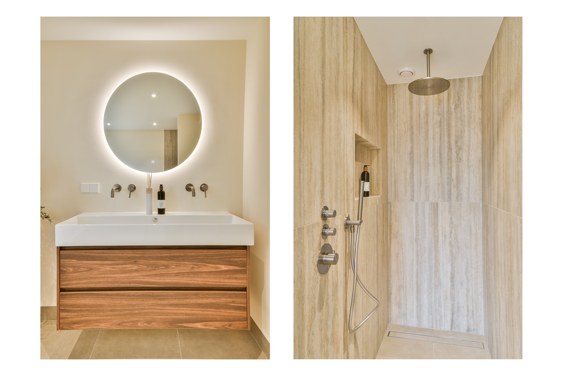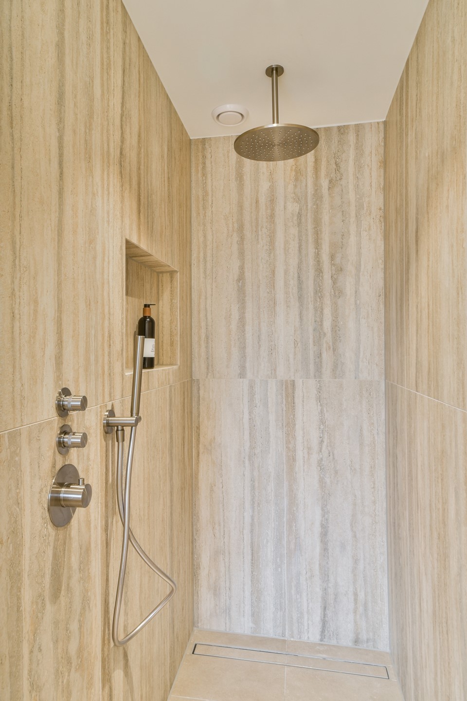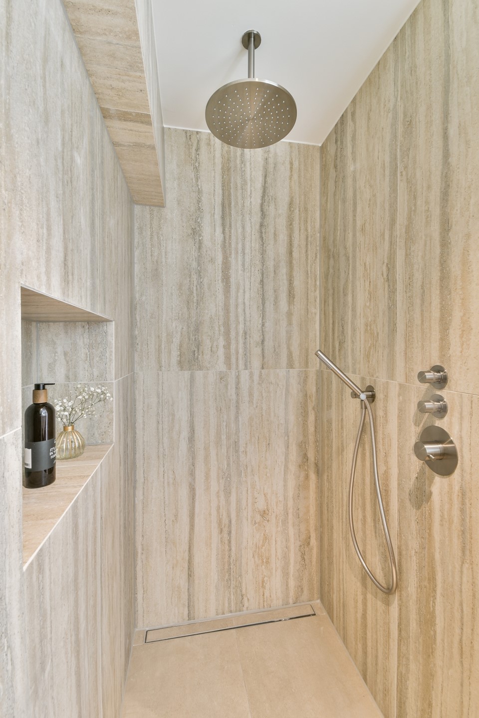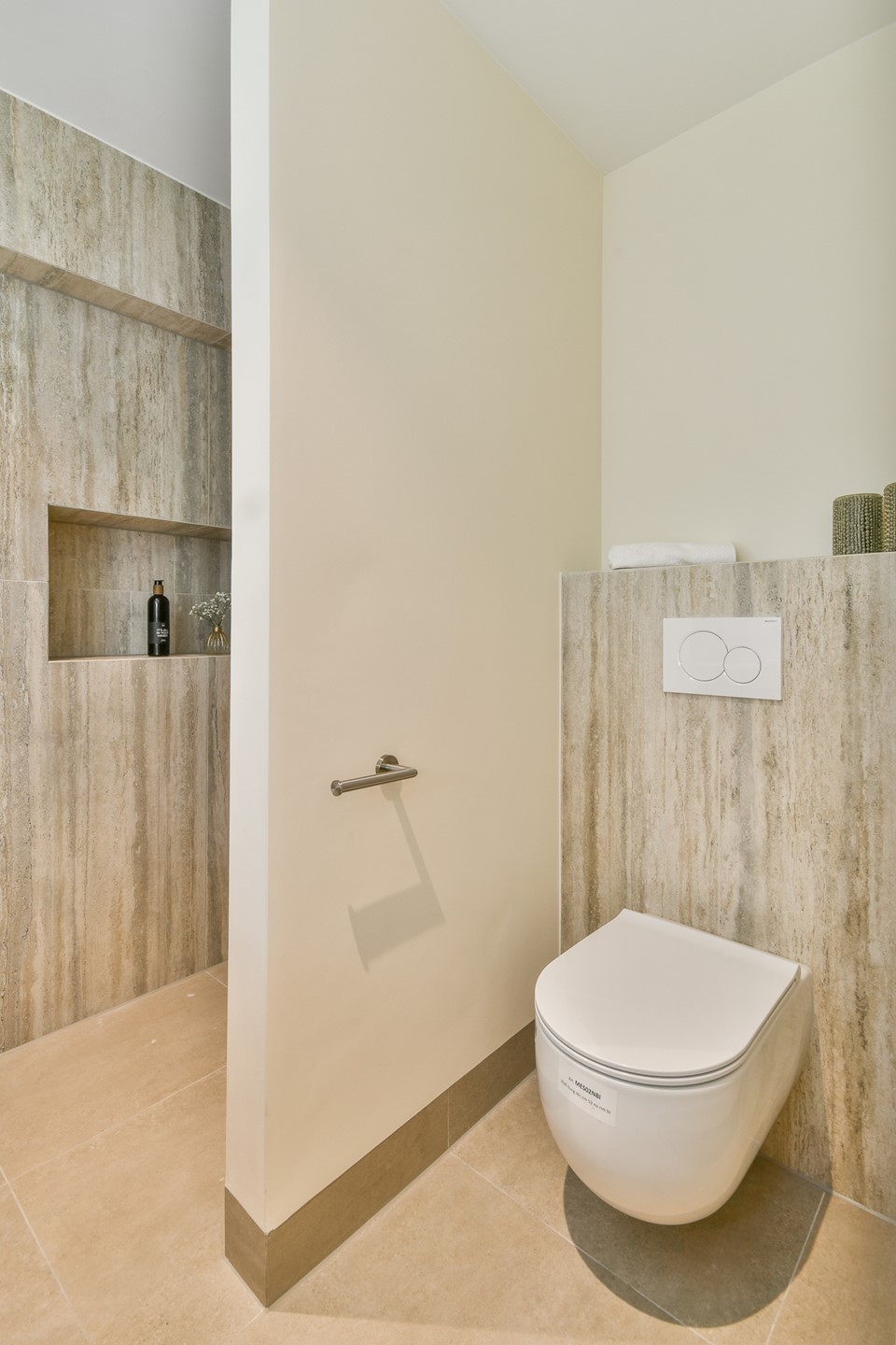 Three comfortable bedrooms, a separate toilet, and a stylish bathroom with luxurious travertine tiling, a walk-in shower, bathtub, and a vanity with a double sink.