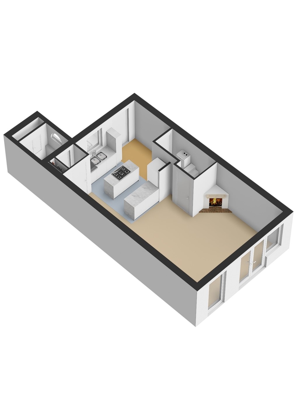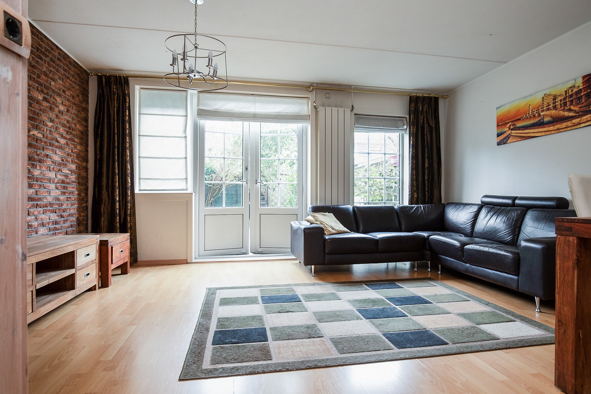 The living room is garden-oriented and gives access to the maintenance-friendly backyard through French doors. Furthermore, the living room is equipped with a fireplace (electric).