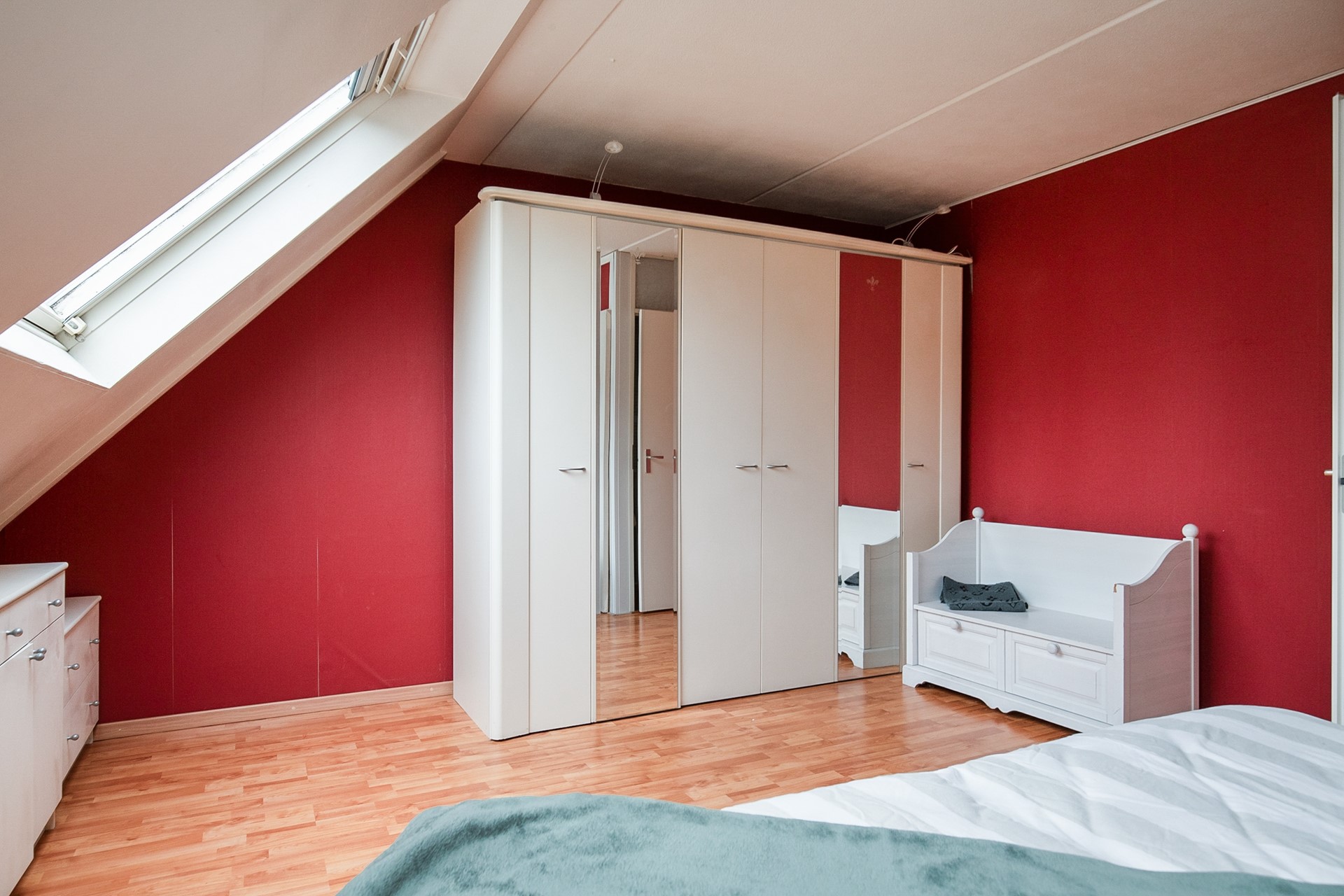 The floor is equipped with two bedrooms, one at the front and one at the rear of the house which is equipped with two skylights.