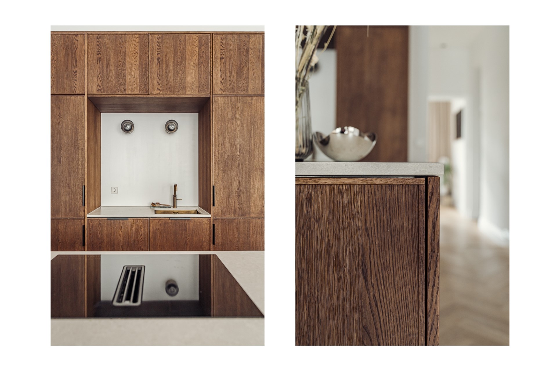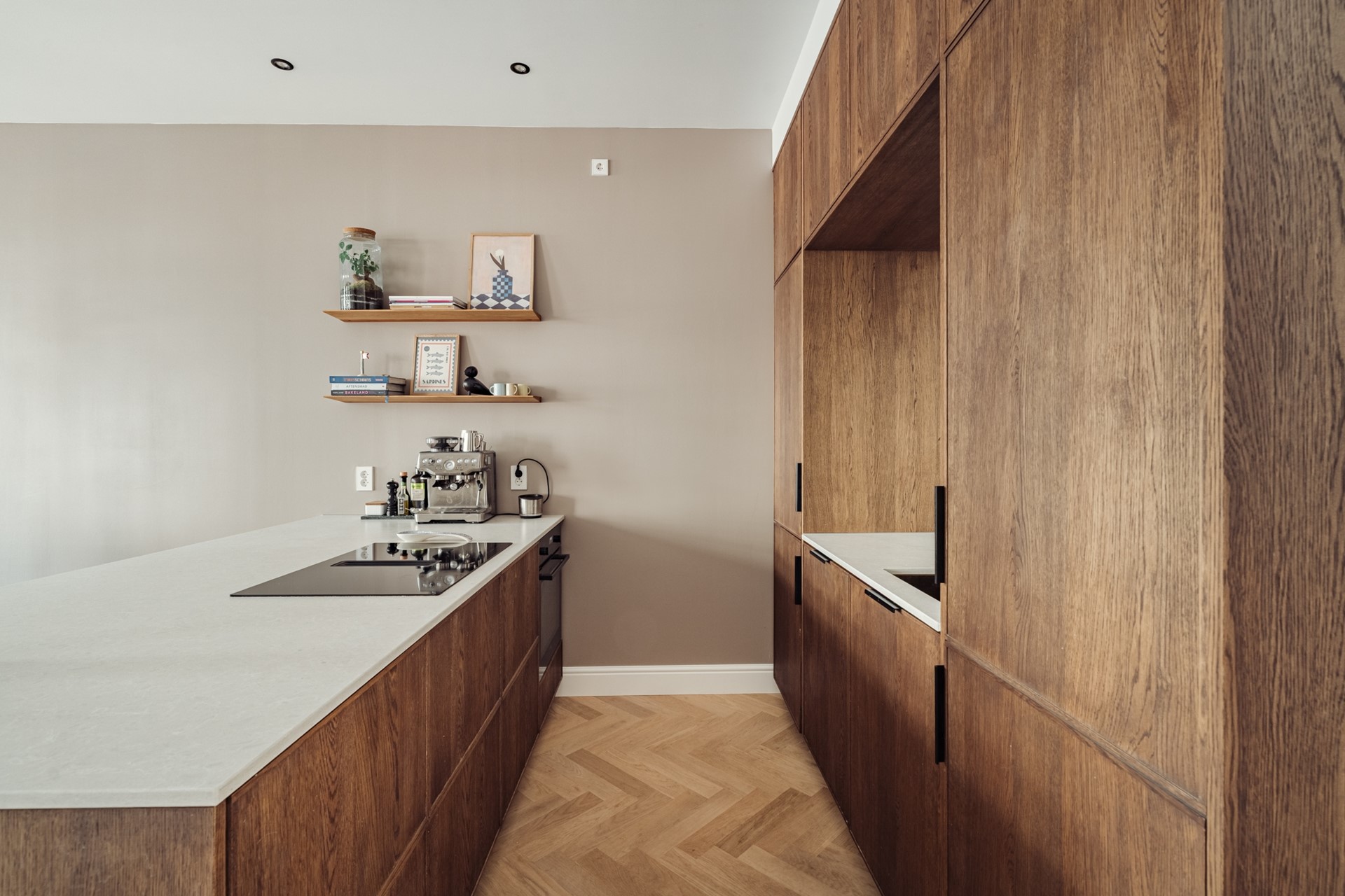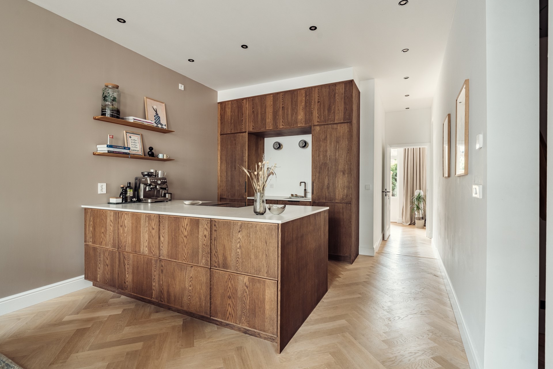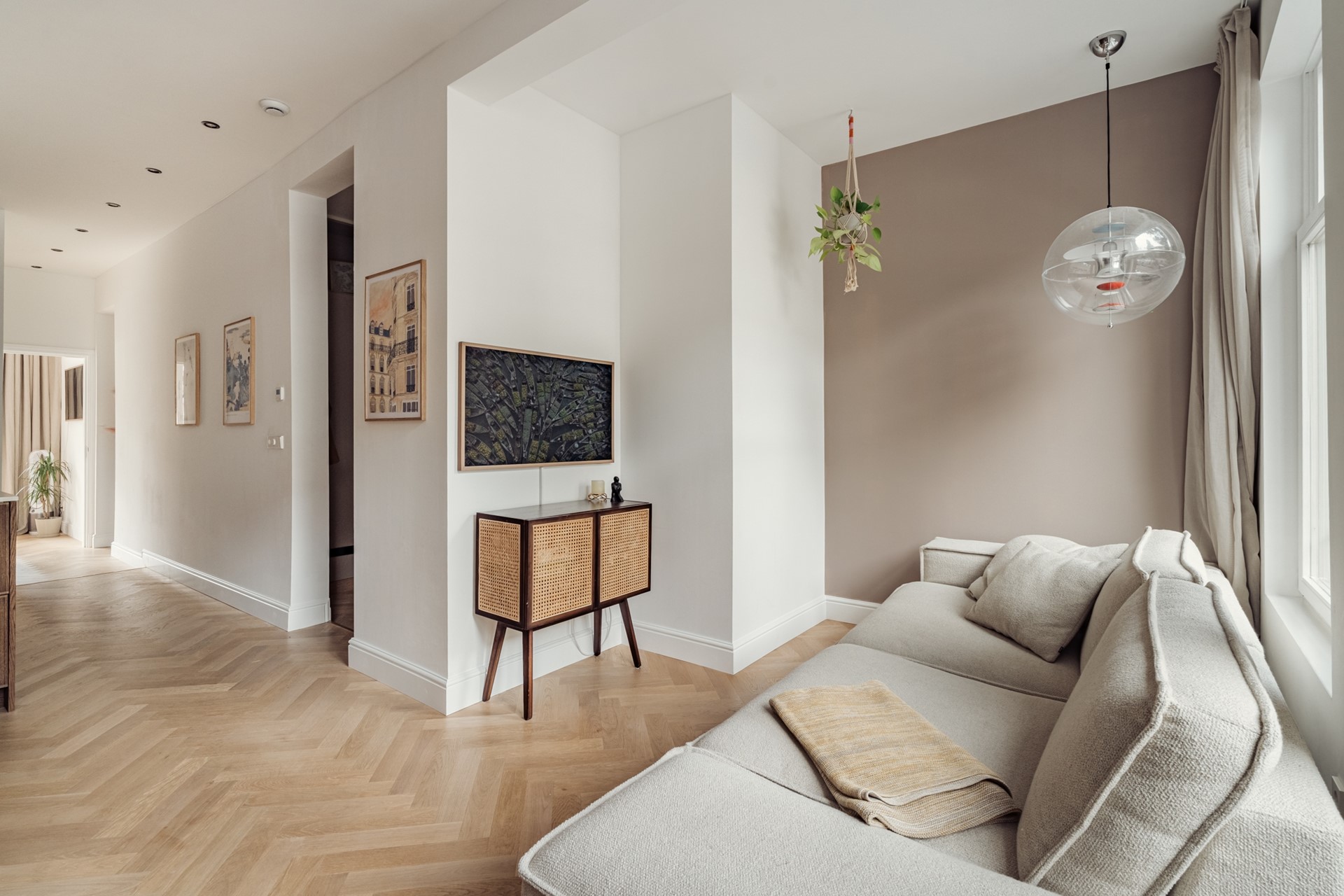The entire apartment is characterized by the use of high-quality materials and installations. It is fitted with a professional lighting plan, oak herringbone parquet flooring, elegant architraves and skirting boards, distinctive door fittings, and underfloor heating throughout.