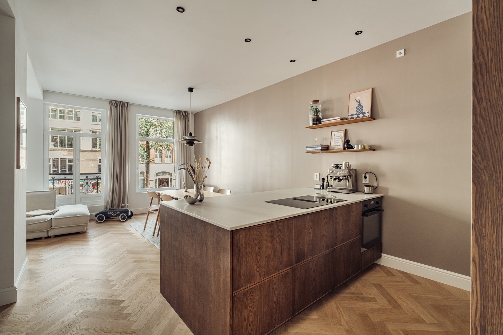 Upon entering, you arrive in the hallway with custom-built cabinets, which provides access to the spacious and bright living room. The living room offers comfortable ceiling height, a French balcony, and a luxurious open kitchen. The high-quality and tasteful kitchen with cooking island is equipped with a beautiful countertop and all conceivable built-in appliances, including a Quooker tap, dishwasher, downdraft induction hob, combination oven/microwave, and fridge-freezer.