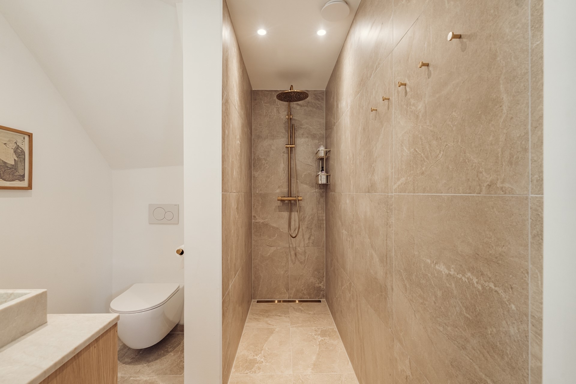At the rear of the apartment are two generously sized bedrooms, both with access to the beautifully landscaped, spacious, and sunny rooftop terrace. Centrally located in the apartment is the stylishly executed and thoughtfully designed bathroom, featuring a walk-in shower, toilet, designer vanity unit, and underfloor heating. Adjacent to the bathroom is a practical laundry room with space for a washing machine and dryer, as well as additional storage for towels, bedding, and linens.