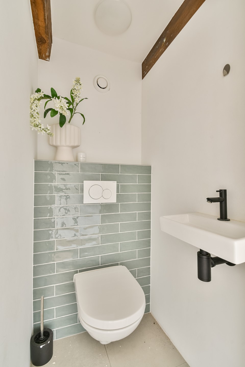The modern kitchen is fully equipped with all conveniences, including an induction cooktop, dishwasher, combi-oven, and refrigerator. In addition, there is a convenient extra storage space and a separate toilet on this floor.