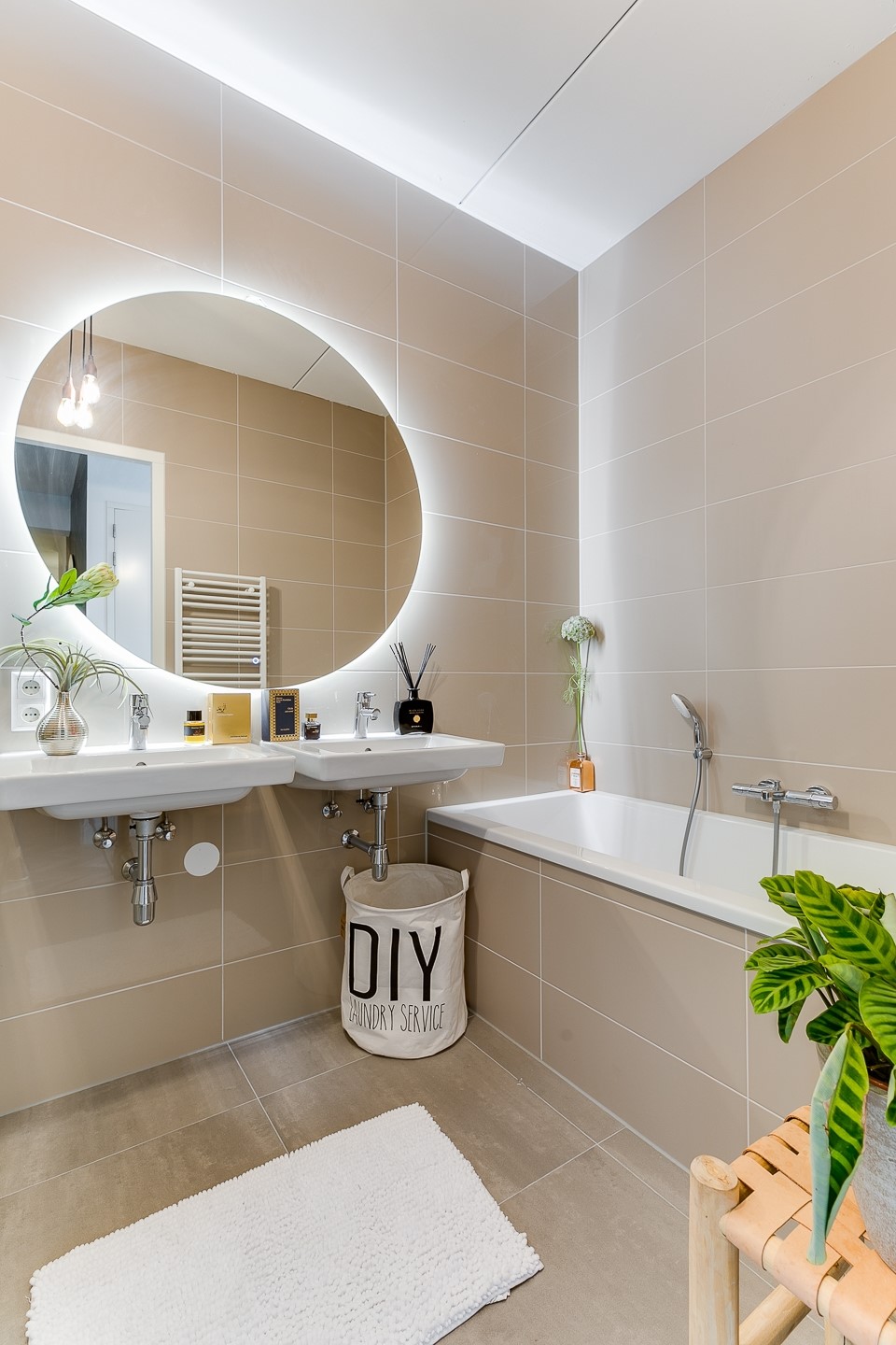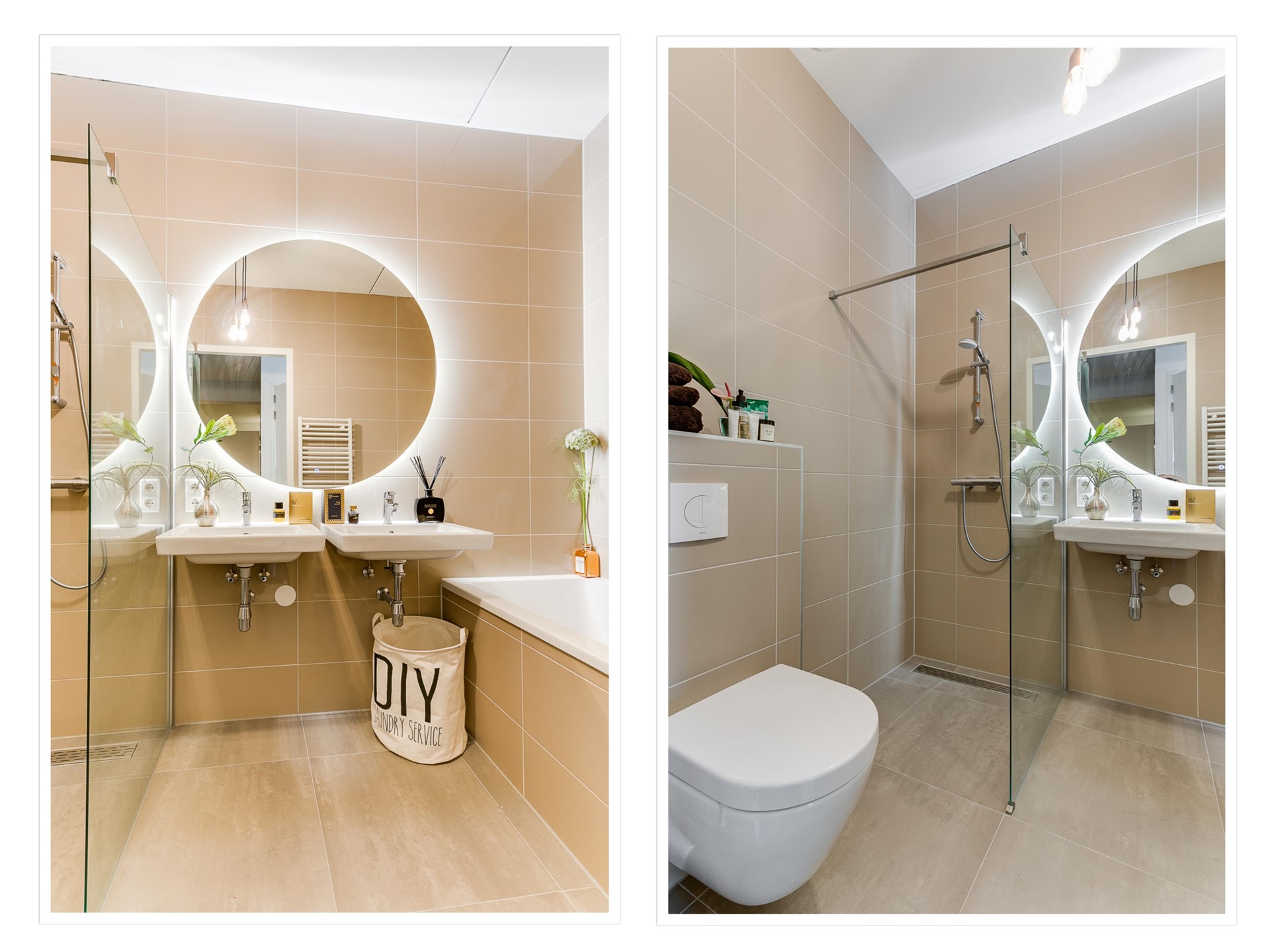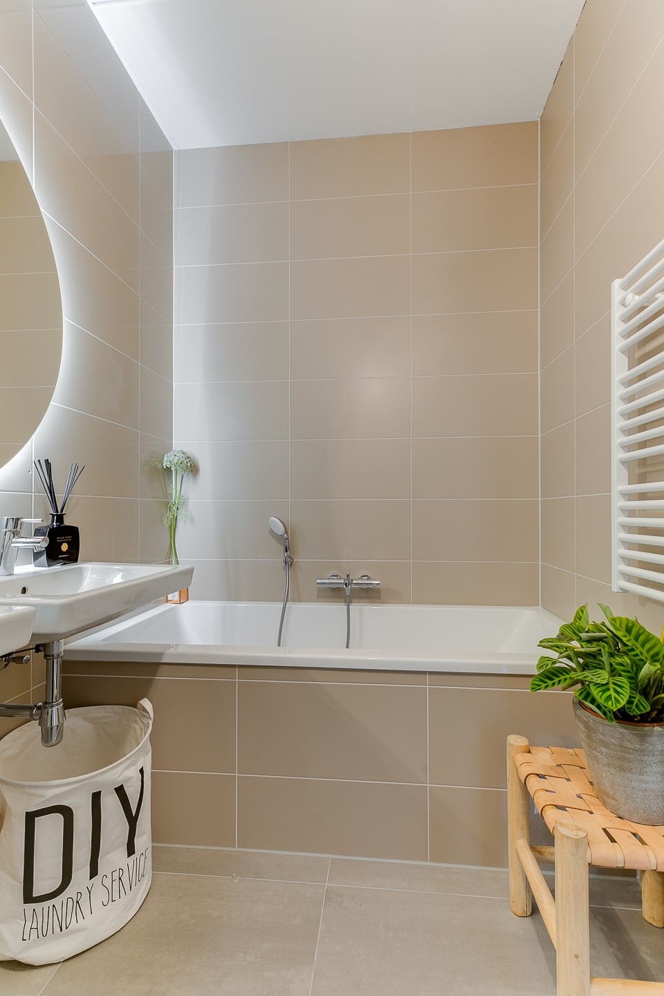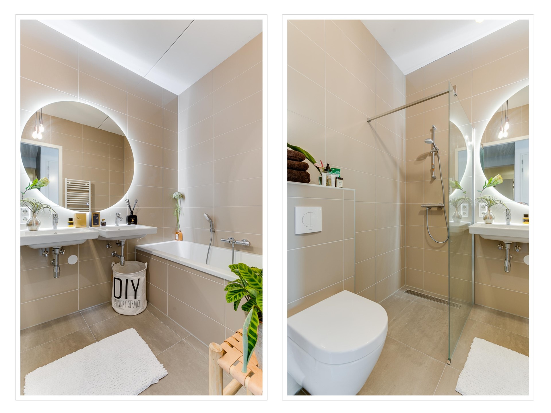 12e verdieping: eigen entree. Ruime hal met meterkast en kast met stadsverwarmingsunit. Royale inpandige berging met opstelling voor wasmachine en droger. Vanuit de gang toegang tot de luxe en moderne badkamer met ligbad, dubbele wastafel, inloopdouche met regendouche, tweede toilet, elektrische handdoek radiator en vloerverwarming. Separaat gastentoilet met fontein en ventilatie.