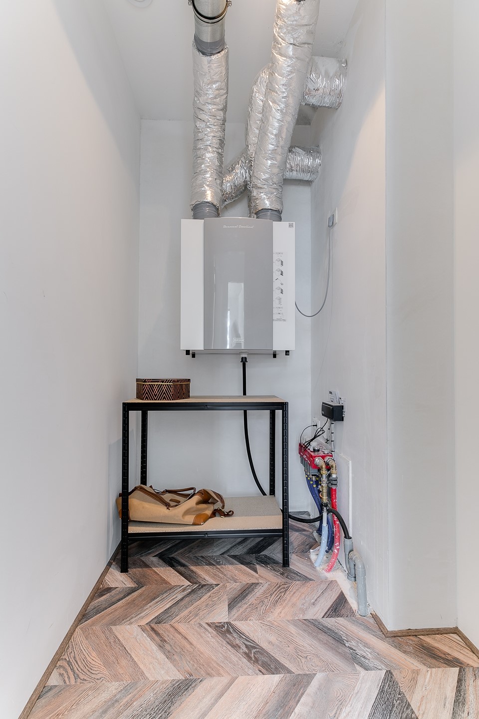 Tweede ruime inpandige berging met WTW-installatie en vloerverwarming installatie en extra bergruimte. De slaapkamer ligt aan de achterzijde van het appartement en heeft directe toegang tot het zonnige terras op het zuidwesten. De woonkamer is dankzij de hoekligging en grote raampartijen bijzonder licht en biedt eveneens toegang tot het terras. De luxe open keuken is compleet uitgevoerd met diverse inbouwapparatuur, waaronder een koelkast, vriezer, inductiekookplaat, RVS afzuigkap met geïntegreerde televisie, combi-oven/magnetron en stoomoven. De gehele woning is voorzien van vloerverwarming en vloerkoeling, per ruimte regelbaar, wat zorgt voor een aangenaam binnenklimaat in elk seizoen.
