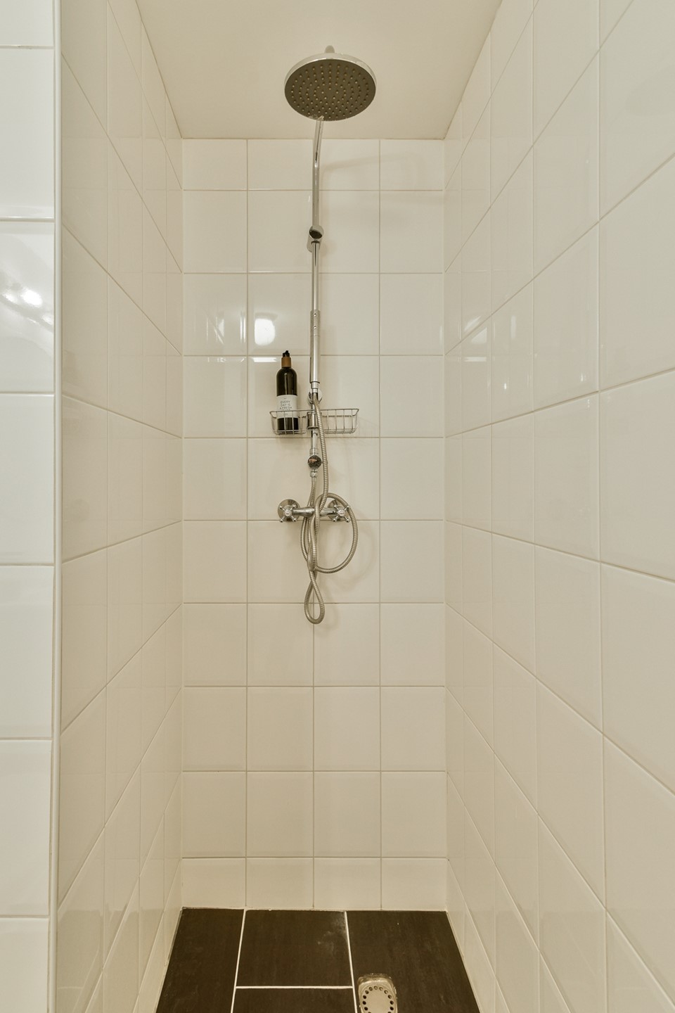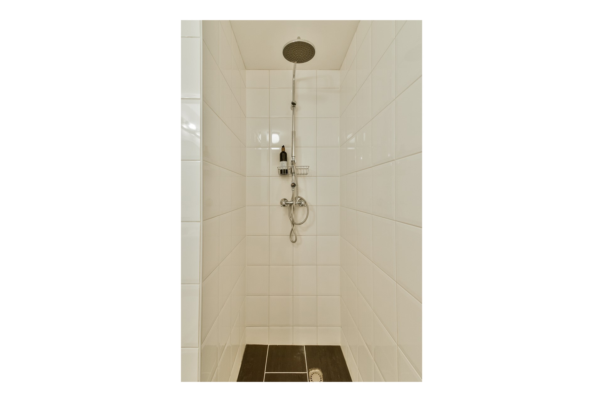 In the center of the apartment is the well-maintained bathroom, fitted with a walk-in shower, toilet, and washbasin with vanity unit.
