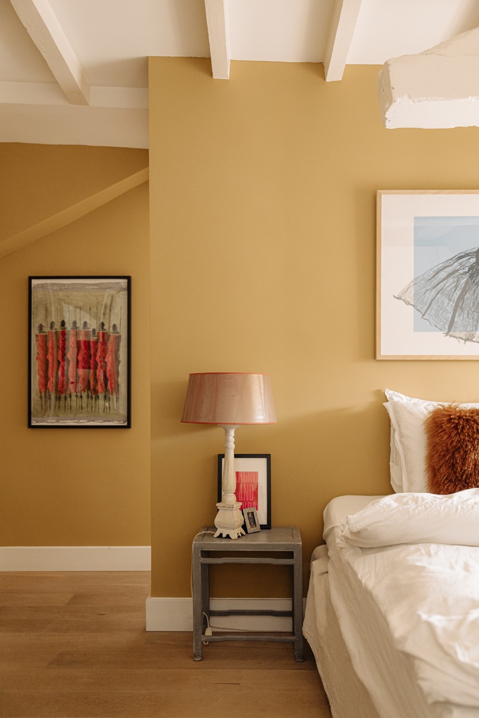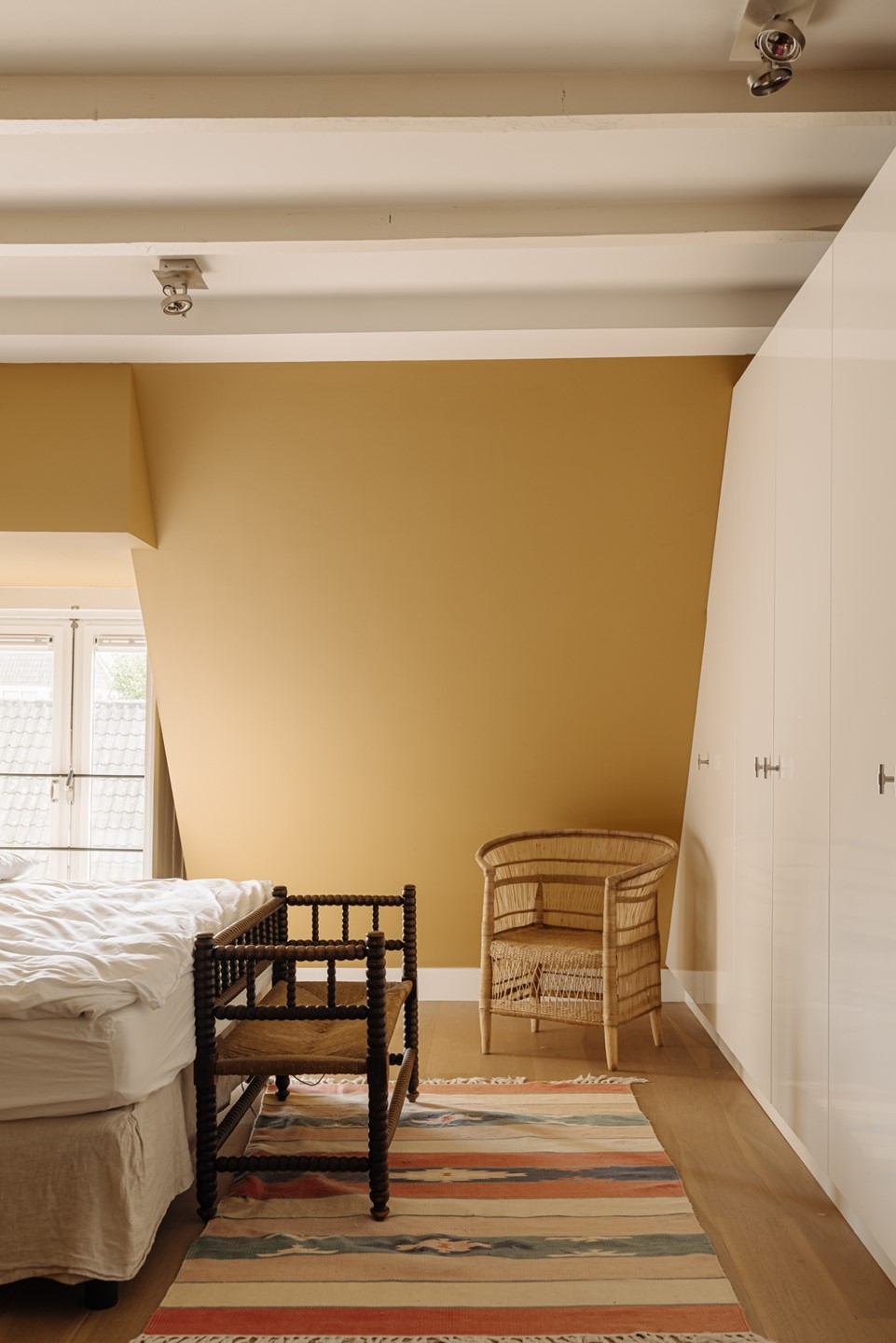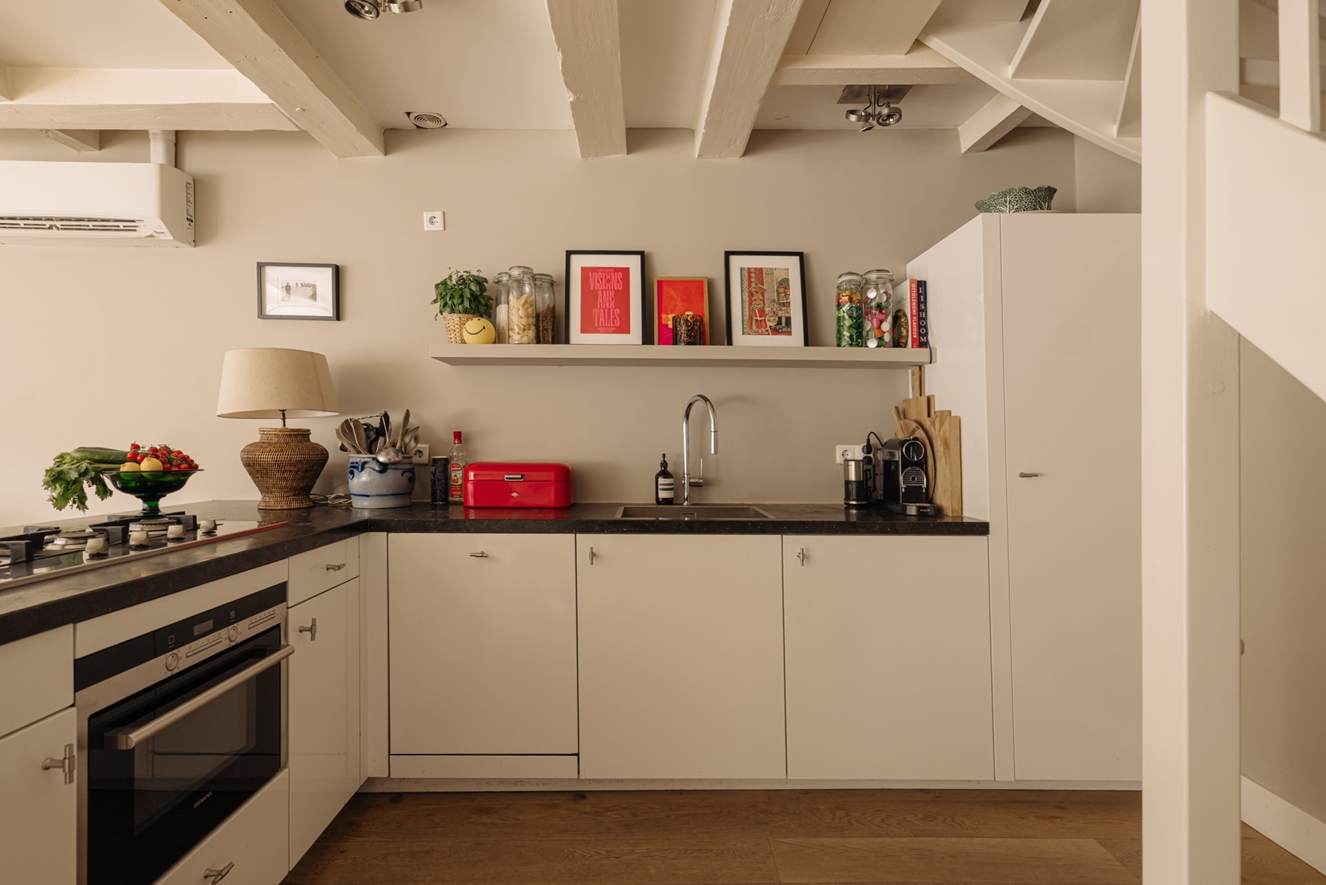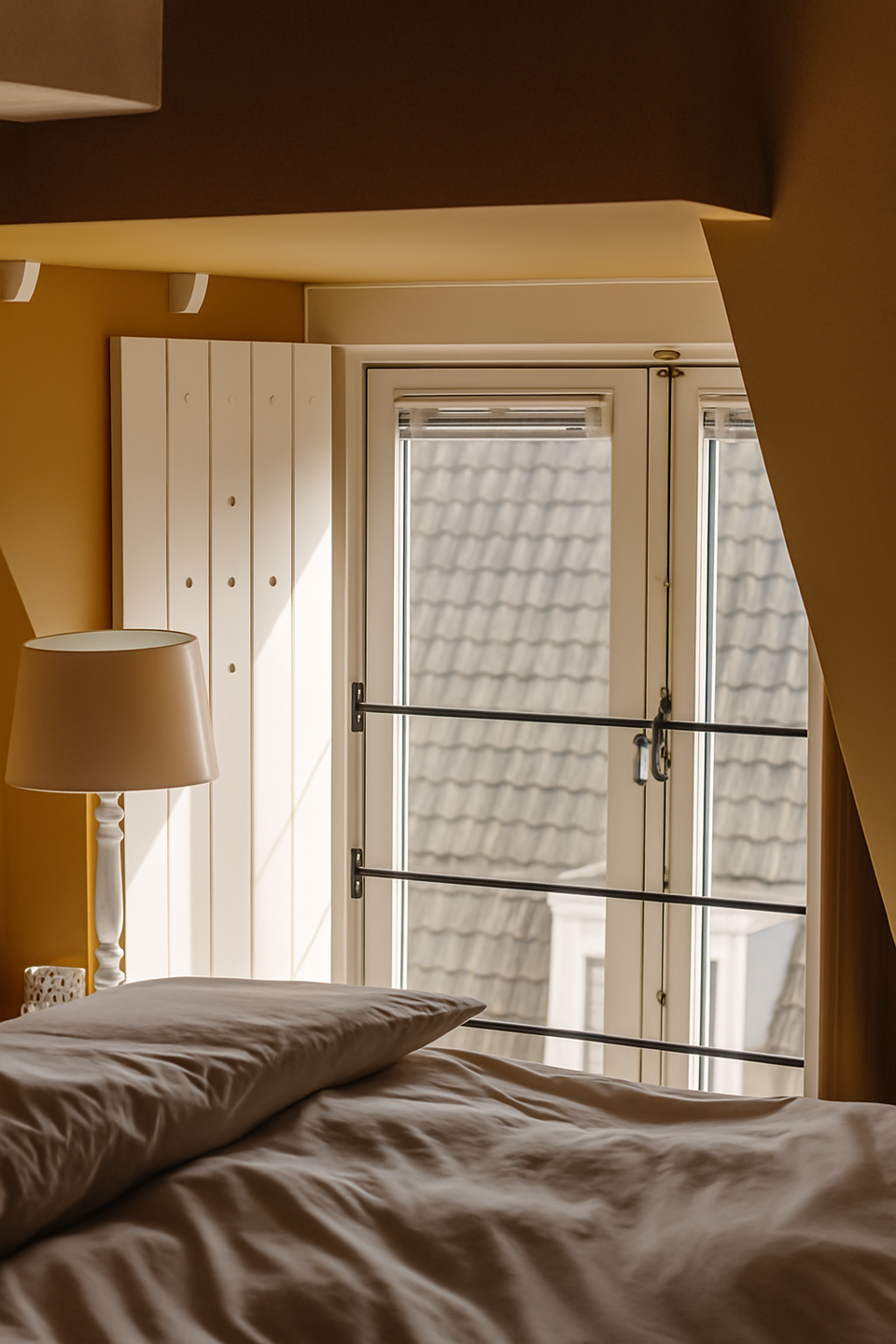 A fixed staircase next to the kitchen leads to the fourth floor, where the landing provides additional storage and access to an internal utility room with washing machine and dryer connections. The master bedroom is generously sized, bright, and atmospheric, partly thanks to the original shutters and the view over Kerkstraat. The second bedroom includes a skylight, air conditioning, and a fixed staircase to the roof.
