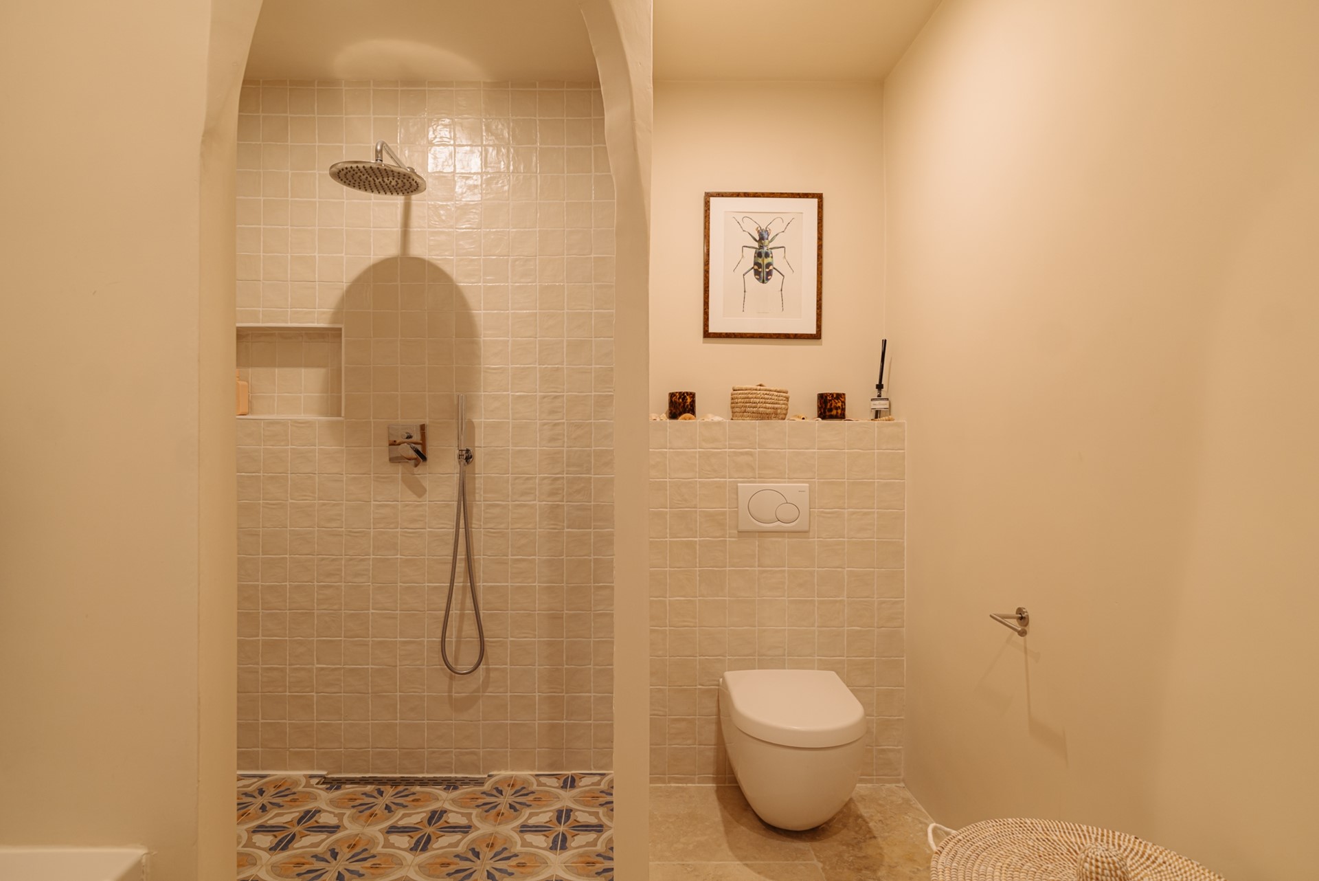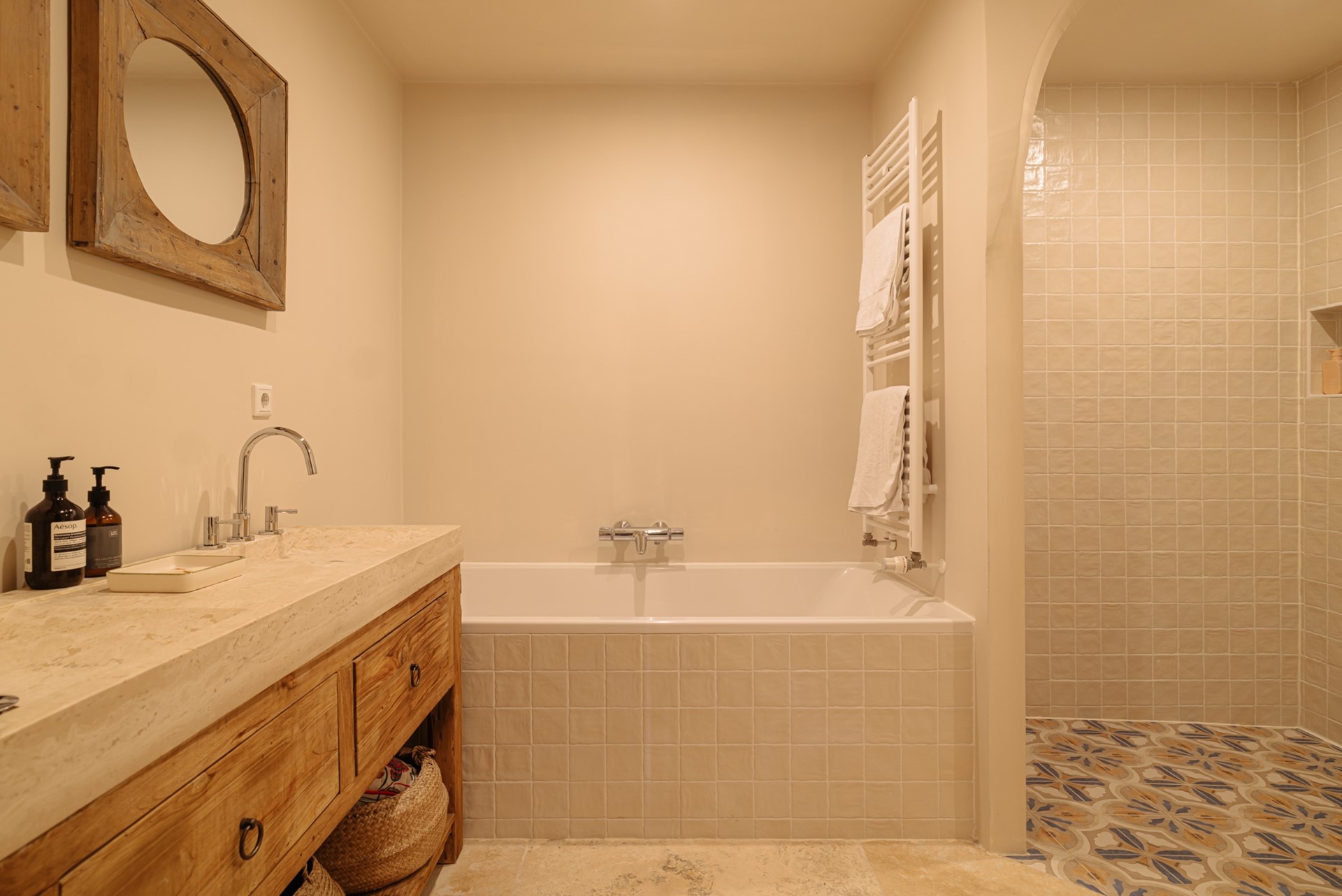 The bathroom, newly renovated in 2023, is stylishly designed and features a bathtub, walk-in shower, double vanity, toilet, and designer towel radiator. Thanks to the building’s hydrophore system, constant water pressure is guaranteed. An internal hallway on the sleeping floor could easily be created to provide separate access to the bathroom and second bedroom (see alternative floor plan).