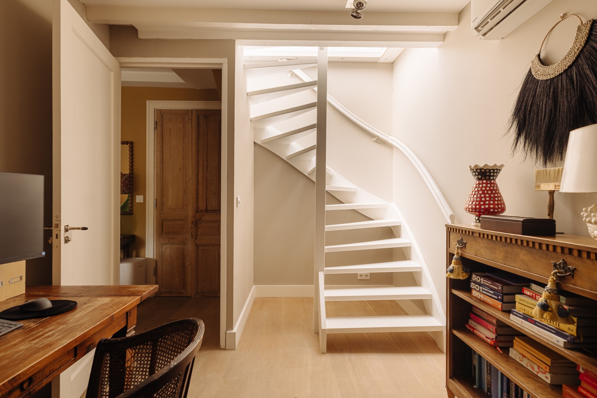 The apartment itself is divided over two floors and includes, among other things, a beautiful wooden floor, air conditioning installations on both levels, a spacious new bathroom, two bedrooms, and an abundance of natural light thanks to its full southern orientation. The second bedroom has a fixed staircase leading to the roof, from where you have a stunning view over the city. Additionally, a parking space in the underground garage is available for purchase.